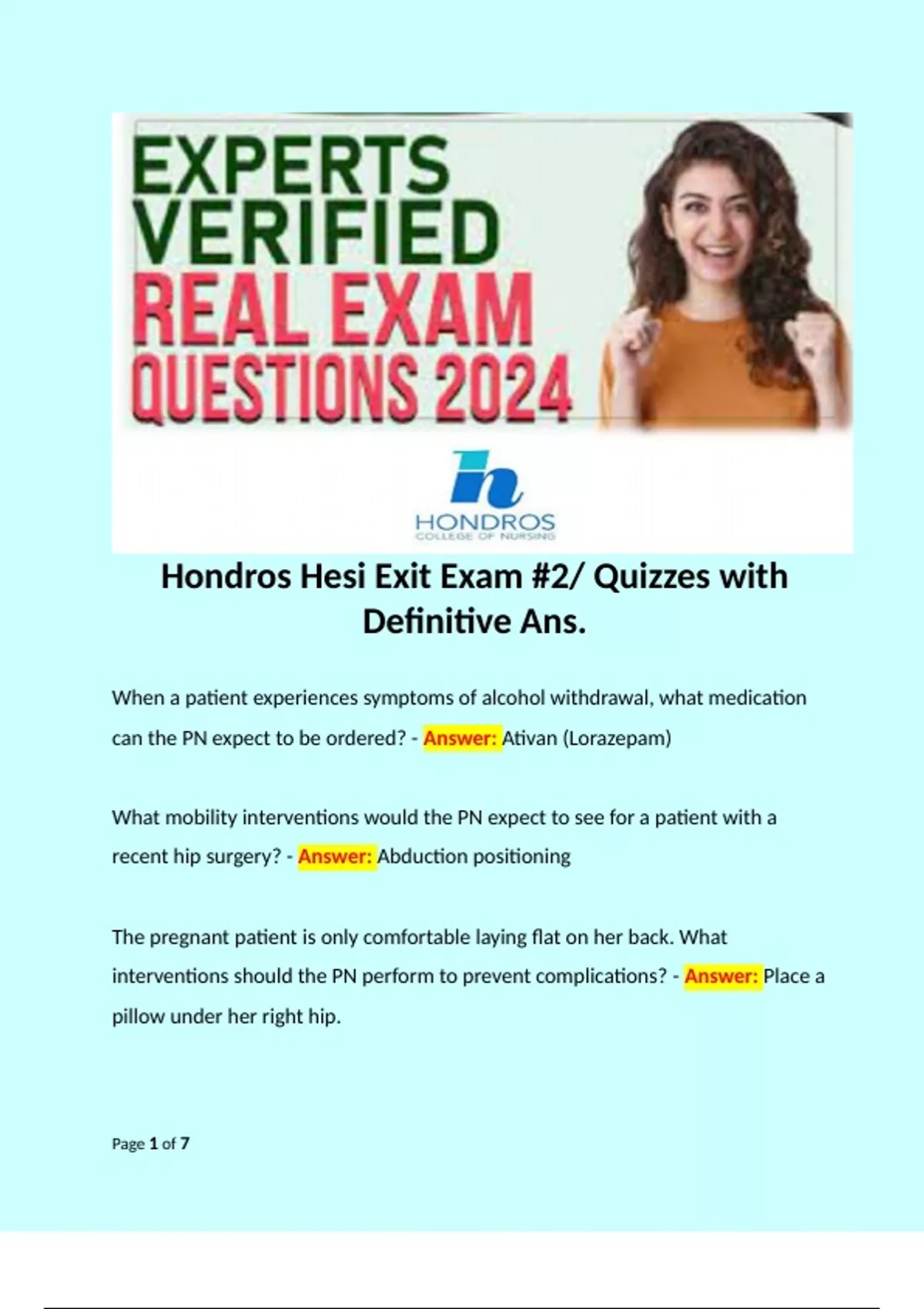 Hondros Hesi Exit Exam #2/ Quizzes with Definitive Ans. When a patient experiences symptoms of alcohol withdrawal, what medication can the PN expect to be ordered? - Answer: Ativan (Lorazepam) What mobility interventions would the PN expect to see for a patient with a recent hip surgery? - Answer: Abduction positioning The pregnant patient is only comfortable laying flat on her back. What interventions should the PN perform to prevent complications? - Answer: Place a pillow under her right hip. The pregnant patient is taking prenatal vitamins, and reports changes in her stool. What can the PN advise her is likely the cause of these changes? - Answer: This is common, especially with taking a vitamin loaded with Iron (FE Sulfate). The patient with liver cirrhosis needs an assessment, what findings would you be looking for in this assessment? Select all that apply. - Answer: Assess the legs, feet, and look for jaundice. (Assessing the legs shows any signs of edema)