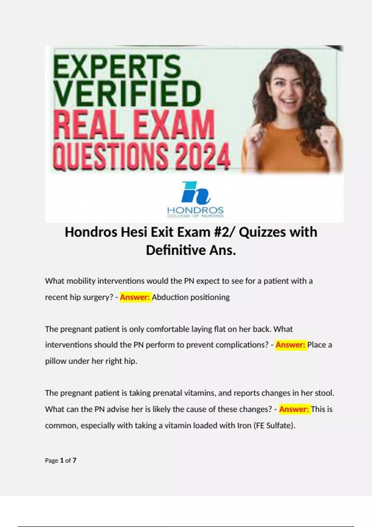Hondros Hesi Exit Exam #2/ Quizzes with Definitive Ans. What mobility interventions would the PN expect to see for a patient with a recent hip surgery? - Answer: Abduction positioning The pregnant patient is only comfortable laying flat on her back. What interventions should the PN perform to prevent complications? - Answer: Place a pillow under her right hip. The pregnant patient is taking prenatal vitamins, and reports changes in her stool. What can the PN advise her is likely the cause of these changes? - Answer: This is common, especially with taking a vitamin loaded with Iron (FE Sulfate). The patient with liver cirrhosis needs an assessment, what findings would you be looking for in this assessment? Select all that apply. - Answer: Assess the legs, feet, and look for jaundice. (Assessing the legs shows any signs of edema) The baby just threw up their dose of Digoxin. What should the PN do next? - Answer: Nothing, monitor, document, and wait for the next scheduled dose.