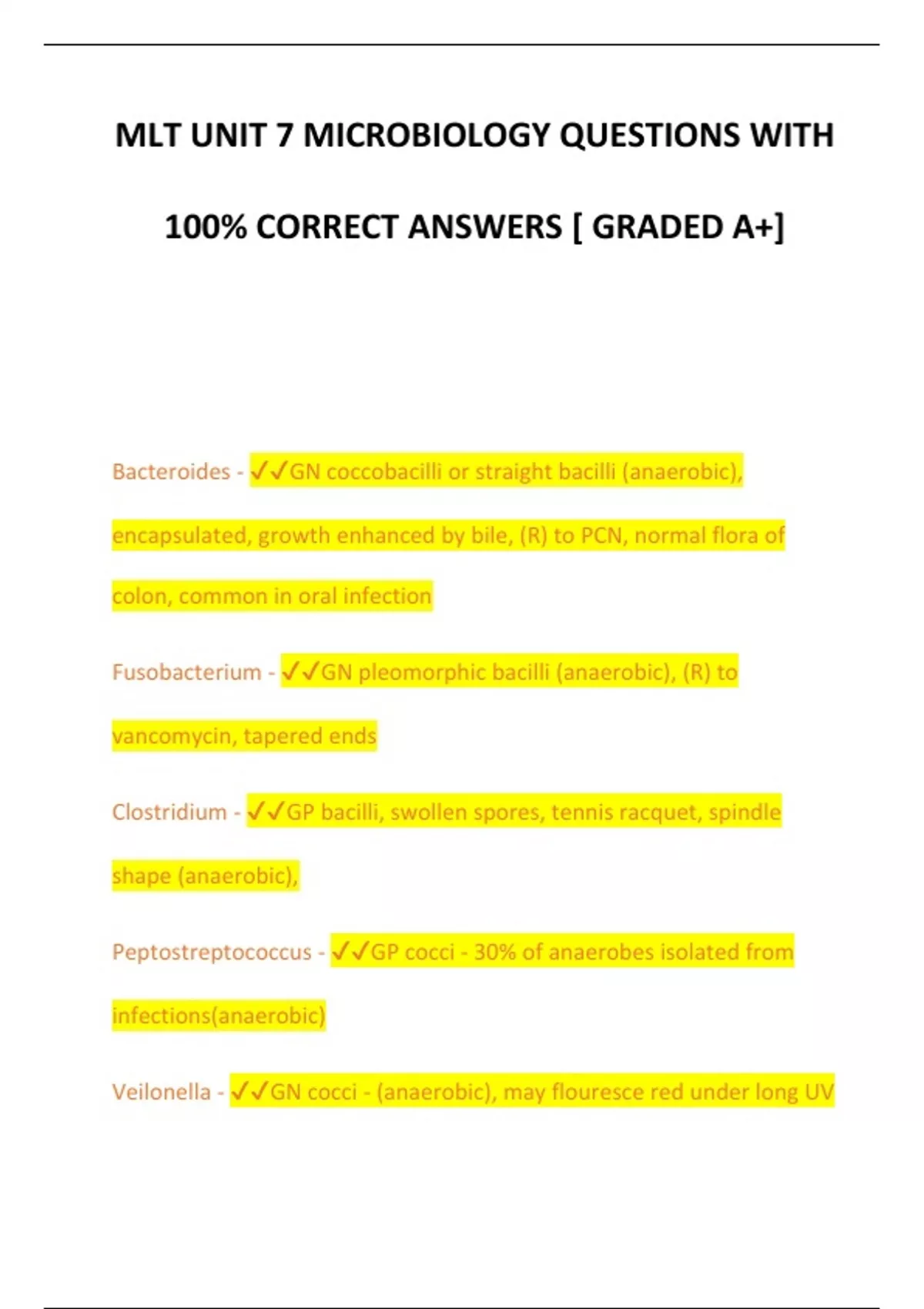 MLT UNIT 7 MICROBIOLOGY QUESTIONS WITH 100% CORRECT ANSWERS [ GRADED A+] Bacteroides - GN coccobacilli or straight bacilli (anaerobic), encapsulated, growth enhanced by bile, (R) to PCN, normal flora of colon, common in oral infection Fusobacterium - GN pleomorphic bacilli (anaerobic), (R) to vancomycin, tapered ends Clostridium - GP bacilli, swollen spores, tennis racquet, spindle shape (anaerobic), Peptostreptococcus - GP cocci - 30% of anaerobes isolated from infections(anaerobic) Veilonella - GN cocci - (anaerobic), may flouresce red under long UV