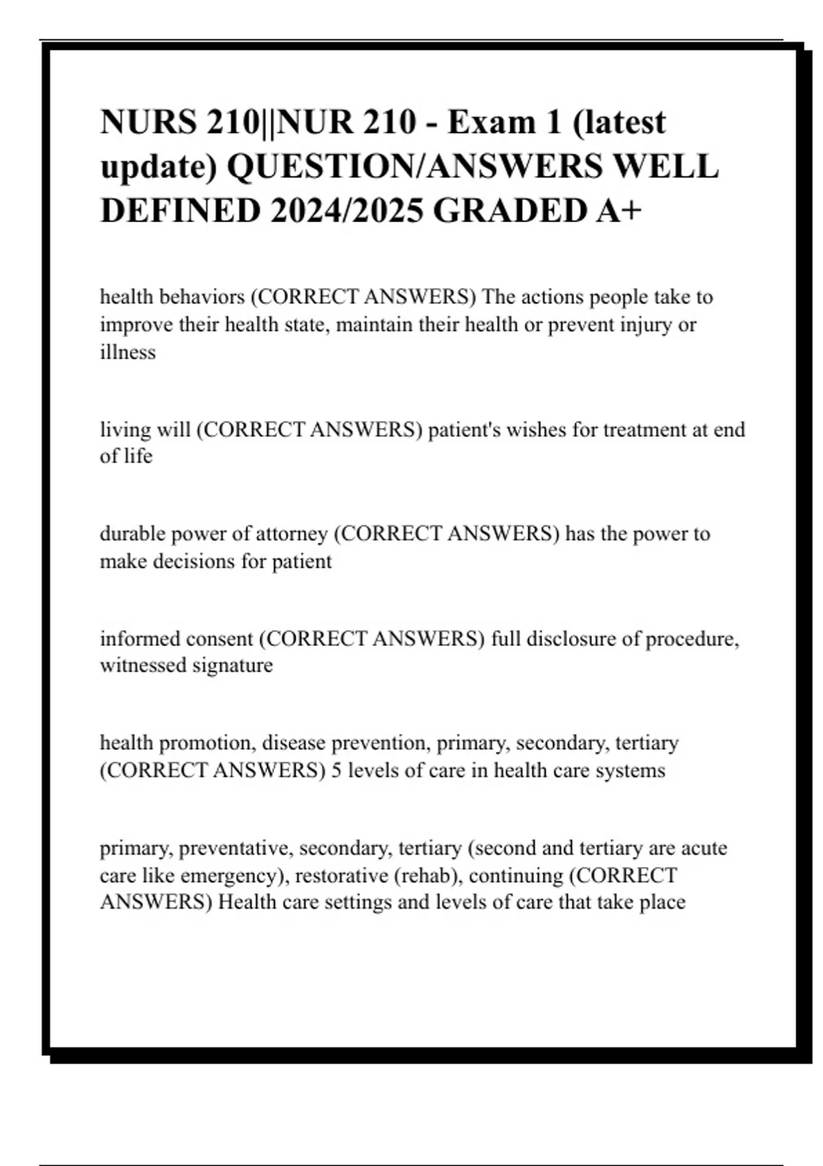 (CORRECT ANSWERS) 5 levels of care in health care systems