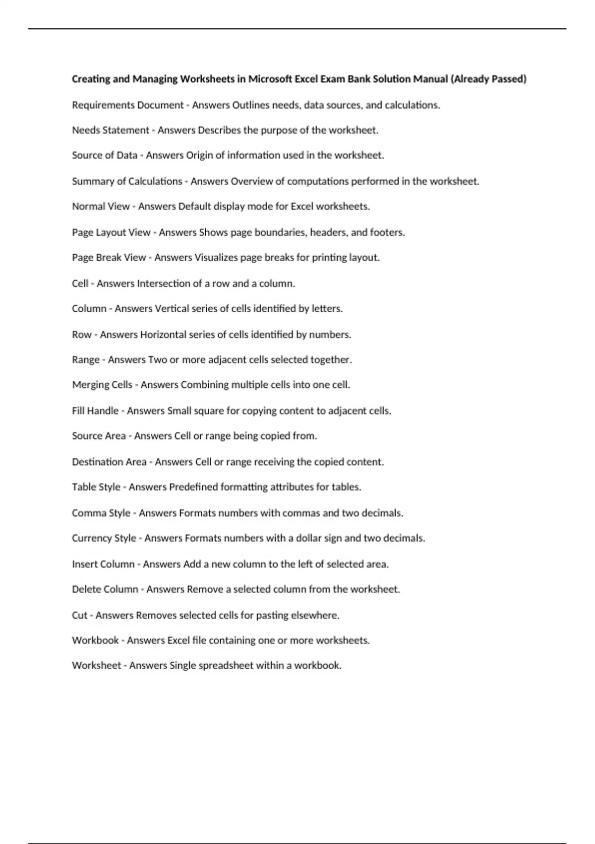 Creating and Managing Worksheets in Microsoft Excel Exam Bank Solution Manual (Already Passed) Requirements Document - Answers Outlines needs, data sources, and calculations. Needs Statement - Answers Describes the purpose of the worksheet. Source of Data - Answers Origin of information used in the worksheet. Summary of Calculations - Answers Overview of computations performed in the worksheet. Normal View - Answers Default display mode for Excel worksheets. Page Layout View - Answers Shows page boundaries, headers, and footers. Page Break View - Answers Visualizes page breaks for printing layout. Cell - Answers Intersection of a row and a column. Column - Answers Vertical series of cells identified by letters. Row - Answers Horizontal series of cells identified by numbers. Range - Answers Two or more adjacent cells selected together. Merging Cells - Answers Combining multiple cells into one cell.