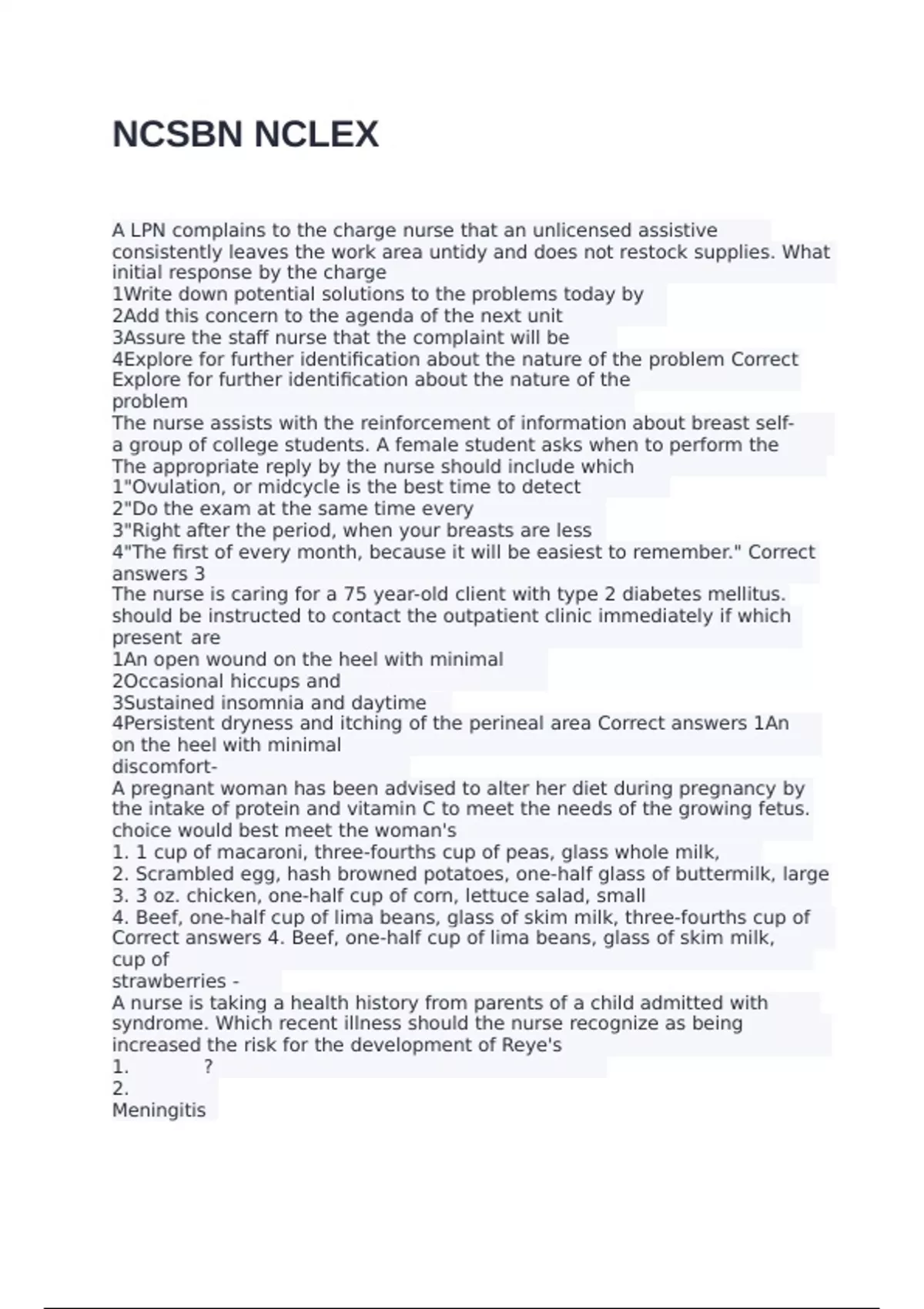 A LPN complains to the charge nurse that an unlicensed assistive person (UAP) consistently leaves the work area untidy and does not restock supplies. What is the best initial response by the charge nurse? 1Write down potential solutions to the problems today by shift's end 2Add this concern to the agenda of the next unit meeting 3Assure the staff nurse that the complaint will be investigated 4Explore for further identification about the nature of the problem Correct answers 4 Explore for further identification about the nature of the problem The nurse assists with the reinforcement of information about breast self-examination to a group of college students. A female student asks when to perform the monthly exam. The appropriate reply by the nurse should include which statement? 1"Ovulation, or midcycle is the best time to detect changes." 2"Do the exam at the same time every month." 3"Right after the period, when your breasts are less tender." 4"The first of every month, because it will be easiest to remember." Correct answers 3 The nurse is caring for a 75 year-old client with type 2 diabetes mellitus. The client should be instructed to contact the outpatient clinic immediately if which findings are present? 1An open wound on the heel with minimal discomfort 2Occasional hiccups and sneezing 3Sustained insomnia and daytime fatigue 4Persistent dryness and itching of the perineal area Correct answers 1An open wound on the heel with minimal discomfort- A pregnant woman has been advised to alter her diet during pregnancy by increasing the intake of protein and vitamin C to meet the needs of the growing fetus. Which diet choice would best meet the woman's needs? 1. 1 cup of macaroni, three-fourths cup of peas, glass whole milk, medium pear 2. Scrambled egg, hash browned potatoes, one-half glass of buttermilk, large nectarine 3. 3 oz. chicken, one-half cup of corn, lettuce salad, small banana 4. Beef, one-half cup of lima beans, glass of skim milk, three-fourths cup of strawberries Correct answers 4. Beef, one-half cup of lima beans, glass of skim milk, three-fourths cup of strawberries - A nurse is taking a health history from parents of a child admitted with possible Reye's syndrome. Which recent illness should the nurse recognize as being associated with an increased the risk for the development of Reye's syndrome? 1. Varicella 2. Meningitis
