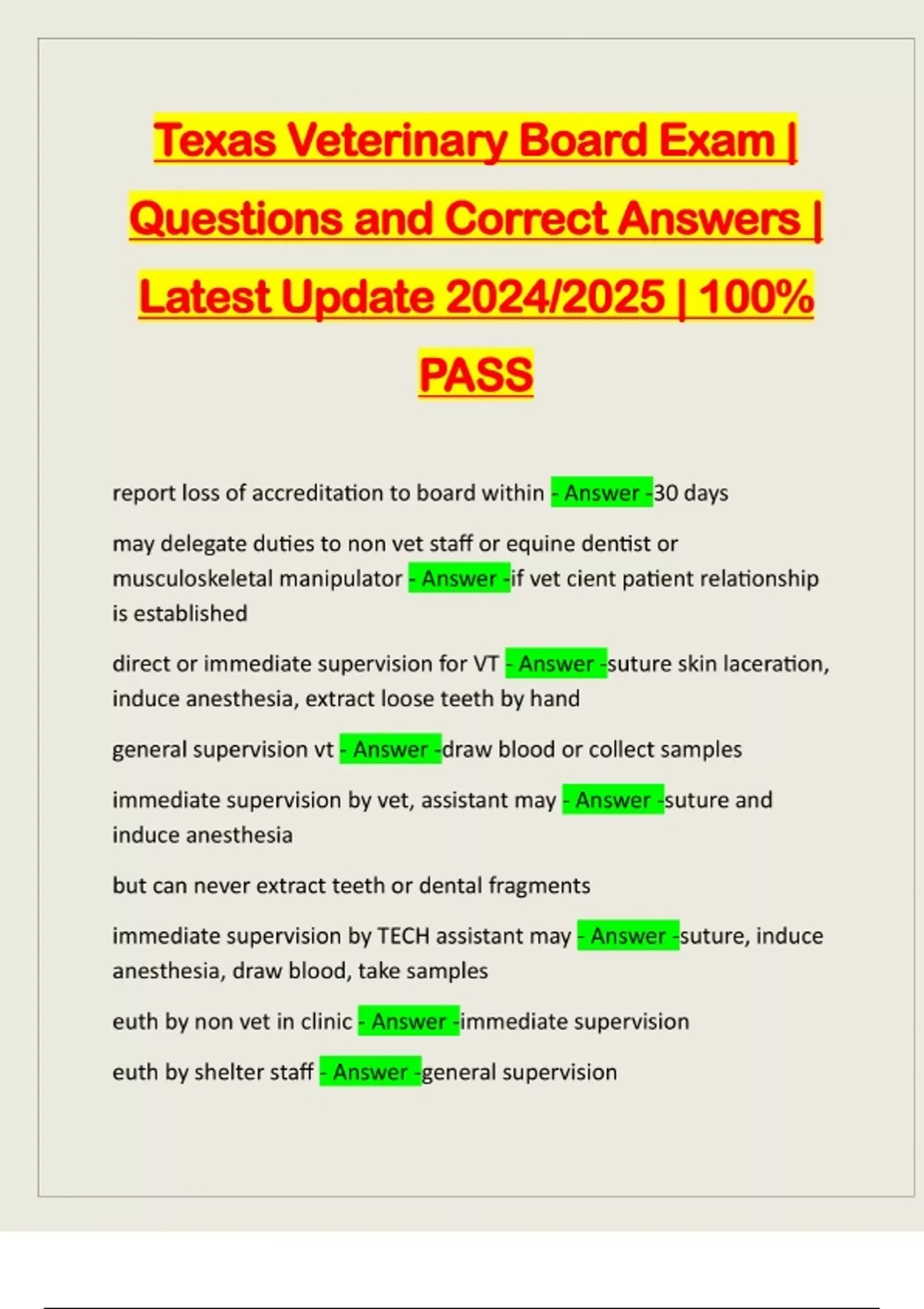 Texas Veterinary Board Exam | Questions and Correct Answers | Latest Update 2024/2025 | 100% PASS report loss of accreditation to board within - Answer -30 days may delegate duties to non vet staff or equine dentist or musculoskeletal manipulator - Answer -if vet cient patient relationship is established direct or immediate supervision for VT - Answer -suture skin laceration, induce anesthesia, extract loose teeth by hand general supervision vt - Answer -draw blood or collect samples immediate supervision by vet, assistant may - Answer -suture and induce anesthesia but can never extract teeth or dental fragments immediate supervision by TECH assistant may - Answer -suture, induce anesthesia, draw blood, take samples euth by non vet in clinic - Answer -immediate supervision euth by shelter staff - Answer -general supervisionrabies vaccine - Answer -direct supervision use of veterinarians stamp - Answer -direct supervision emergency care where promt treatment is needed - Answer -genera