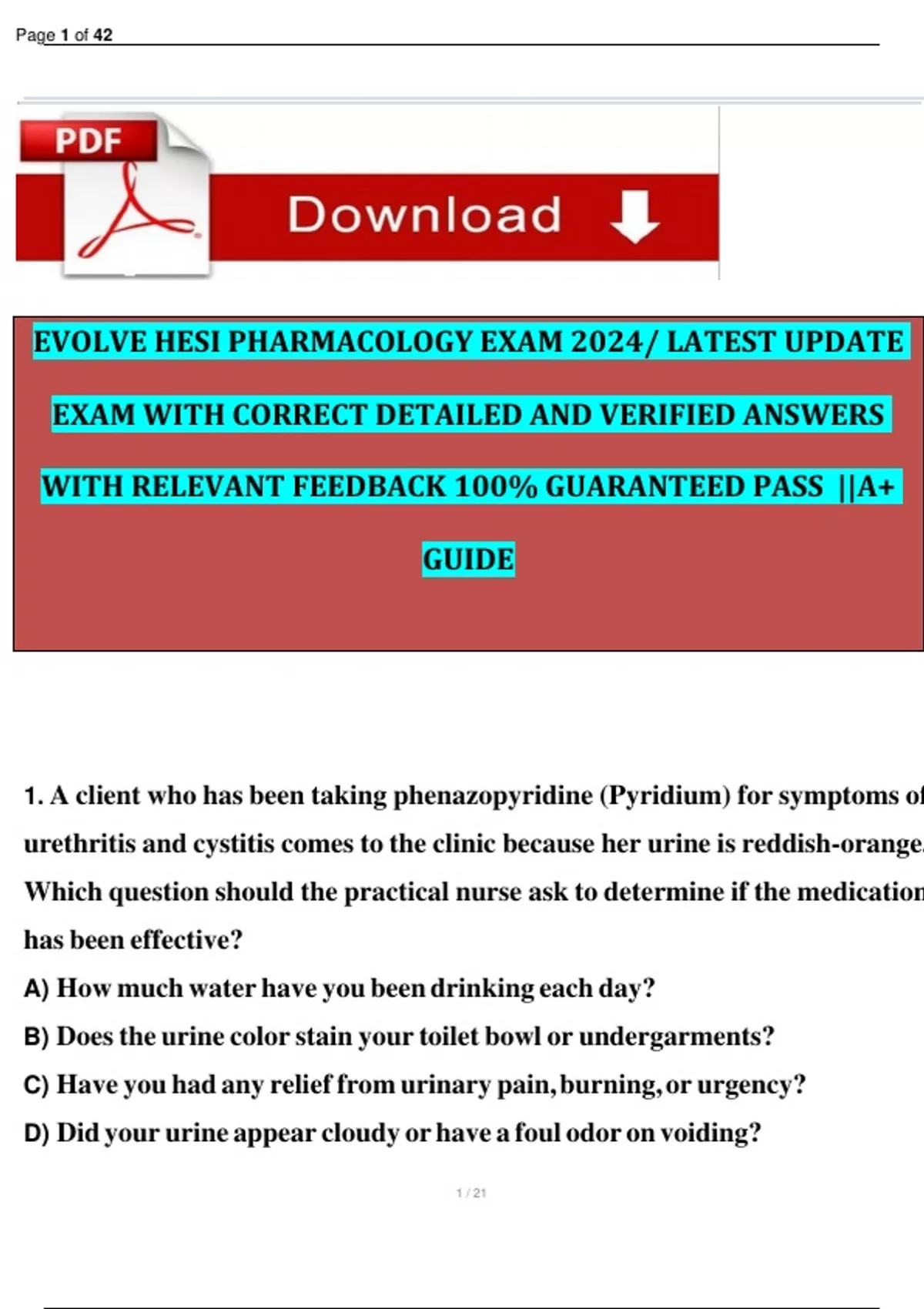 1. A client who has been taking phenazopyridine (Pyridium) for symptoms of