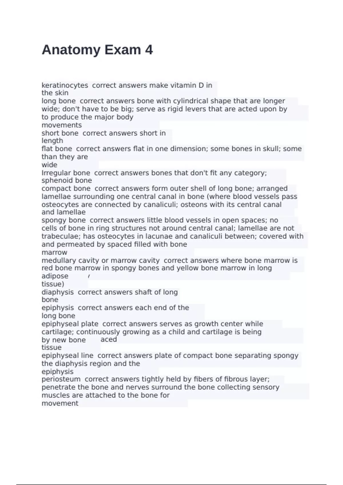 keratinocytes correct answers make vitamin D in the skin long bone correct answers bone with cylindrical shape that are longer than they are wide; don't have to be big; serve as rigid levers that are acted upon by skeletal muscles to produce the major body movements short bone correct answers short in length flat bone correct answers flat in one dimension; some bones in skull; some are longer than they are wide Irregular bone correct answers bones that don't fit any category; sphenoid bone compact bone correct answers form outer shell of long bone; arranged in lamellae; lamellae surrounding one central canal in bone (where blood vessels pass through); osteocytes are connected by canaliculi; osteons with its central canal and lamellae spongy bone correct answers little blood vessels in open spaces; no central canals; cells of bone in ring structures not around central canal; lamellae are not all parallel = trabeculae; has osteocytes in lacunae and canaliculi between; covered with endosteum and permeated by spaced filled with bone marrow medullary cavity or marrow cavity correct answers where bone marrow is in the bone; red bone marrow in spongy bones and yellow bone marrow in long bones (mostly adipose tissue) diaphysis correct answers shaft of long bone epiphysis correct answers each end of the long bone epiphyseal plate correct answers serves as growth center while bone replaces cartilage; continuously growing as a child and cartilage is being continuously replaced by new bone tissue epiphyseal line correct answers plate of compact bone separating spongy bone from the diaphysis region and the epiphysis periosteum correct answers tightly held by fibers of fibrous layer; blood vessels penetrate the bone and nerves surround the bone collecting sensory information; where muscles are attached to the bone for movement