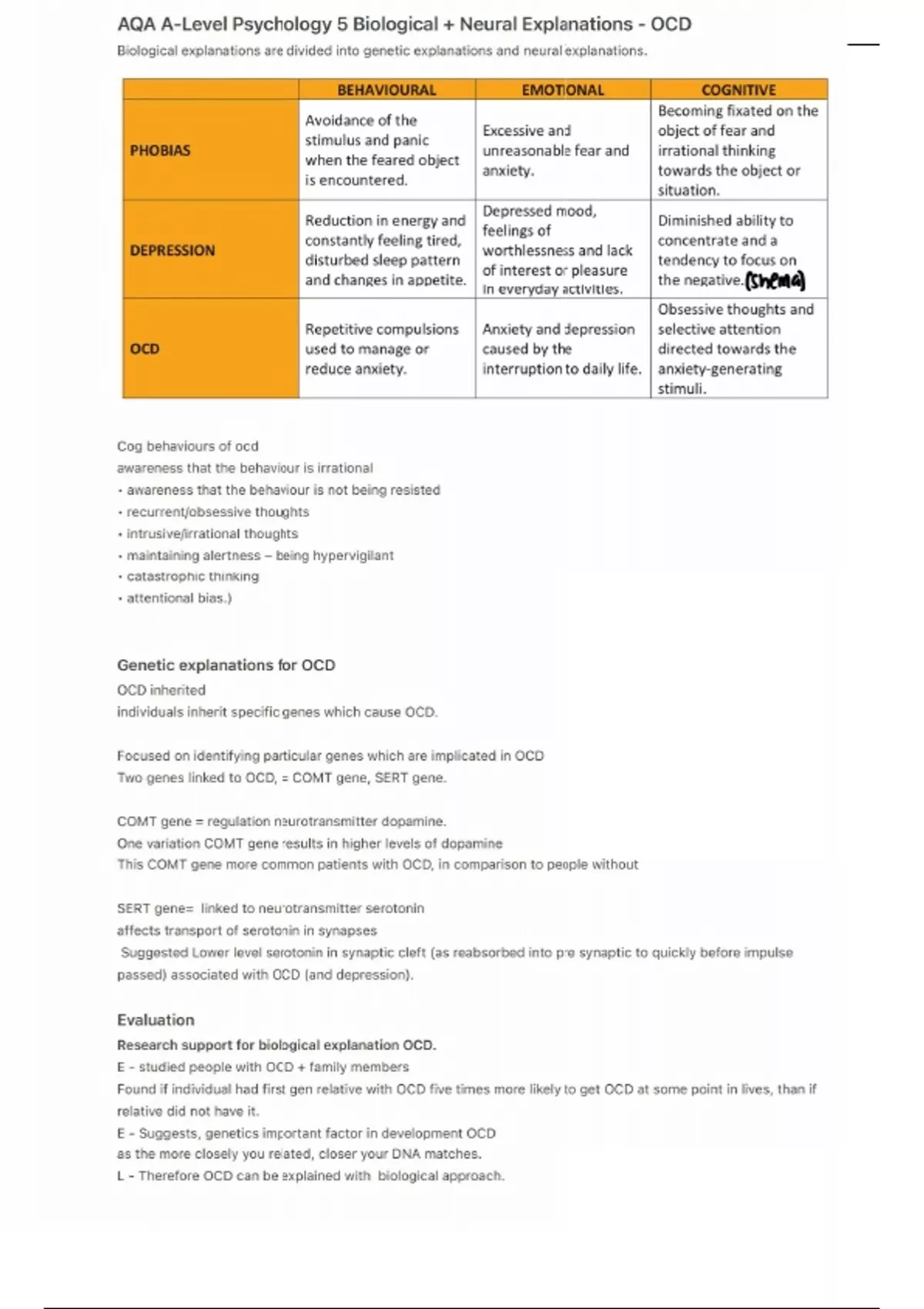 ophic thinking • attentional bias.) Genetic explanations for OCD OCD inherited individuals inherit specific genes which cause OCD. Focused on identifying particular genes which are implicated in OCD Two genes linked to OCD, = COMT gene, SERT gene. COMT gene = regulation neurotransmitter dopamine. One variation COMT gene results in higher levels of dopamine This COMT gene more common patients with OCD, in comparison to people without SERT gene= linked to neurotransmitter serotonin affects tran ... Purchase document to see full attachment