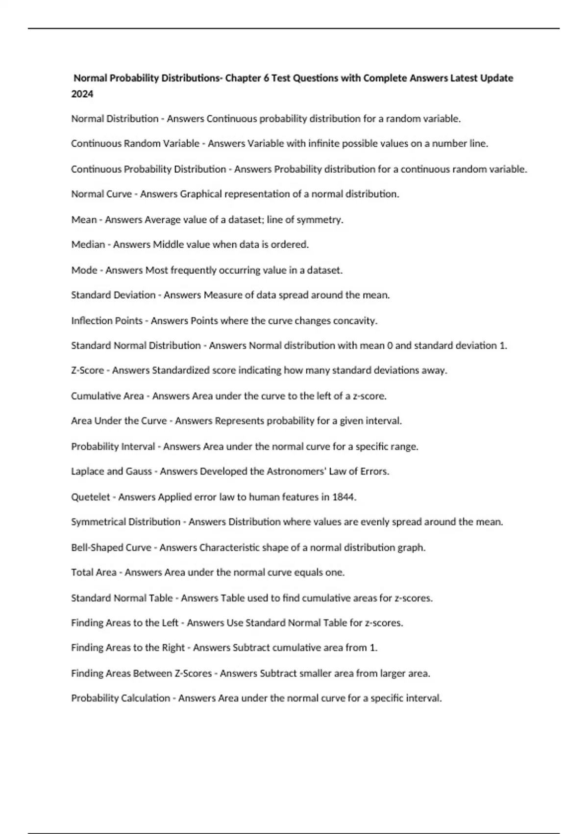 Normal Probability Distributions- Chapter 6 Test Questions with Complete Answers Latest Update 2024 Normal Distribution - Answers Continuous probability distribution for a random variable. Continuous Random Variable - Answers Variable with infinite possible values on a number line. Continuous Probability Distribution - Answers Probability distribution for a continuous random variable. Normal Curve - Answers Graphical representation of a normal distribution. Mean - Answers Average value of a dataset; line of symmetry. Median - Answers Middle value when data is ordered. Mode - Answers Most frequently occurring value in a dataset. Standard Deviation - Answers Measure of data spread around the mean. Inflection Points - Answers Points where the curve changes concavity. Standard Normal Distribution - Answers Normal distribution with mean 0 and standard deviation 1. Z-Score - Answers Standardized score indicating how many standard deviations away. Cumulative Area - Answers Area under the curve to the left of a z-score. Area Under the Curve - Answers Represents probability for a given interval. Probability Interval - Answers Area under the normal curve for a specific range. Laplace and Gauss - Answers Developed the Astronomers' Law of Errors. Quetelet - Answers Applied error law to human features in 1844. Symmetrical Distribution - Answers Distribution where values are evenly spread around the mean. Bell-Shaped Curve - Answers Characteristic shape of a normal distribution graph. Total Area - Answers Area under the normal curve equals one. Standard Normal Table - Answers Table used to find cumulative areas for z-scores. Finding Areas to the Left - Answers Use Standard Normal Table for z-scores. Finding Areas to the Right - Answers Subtract cumulative area from 1. Finding Areas Between Z-Scores - Answers Subtract smaller area from larger area.