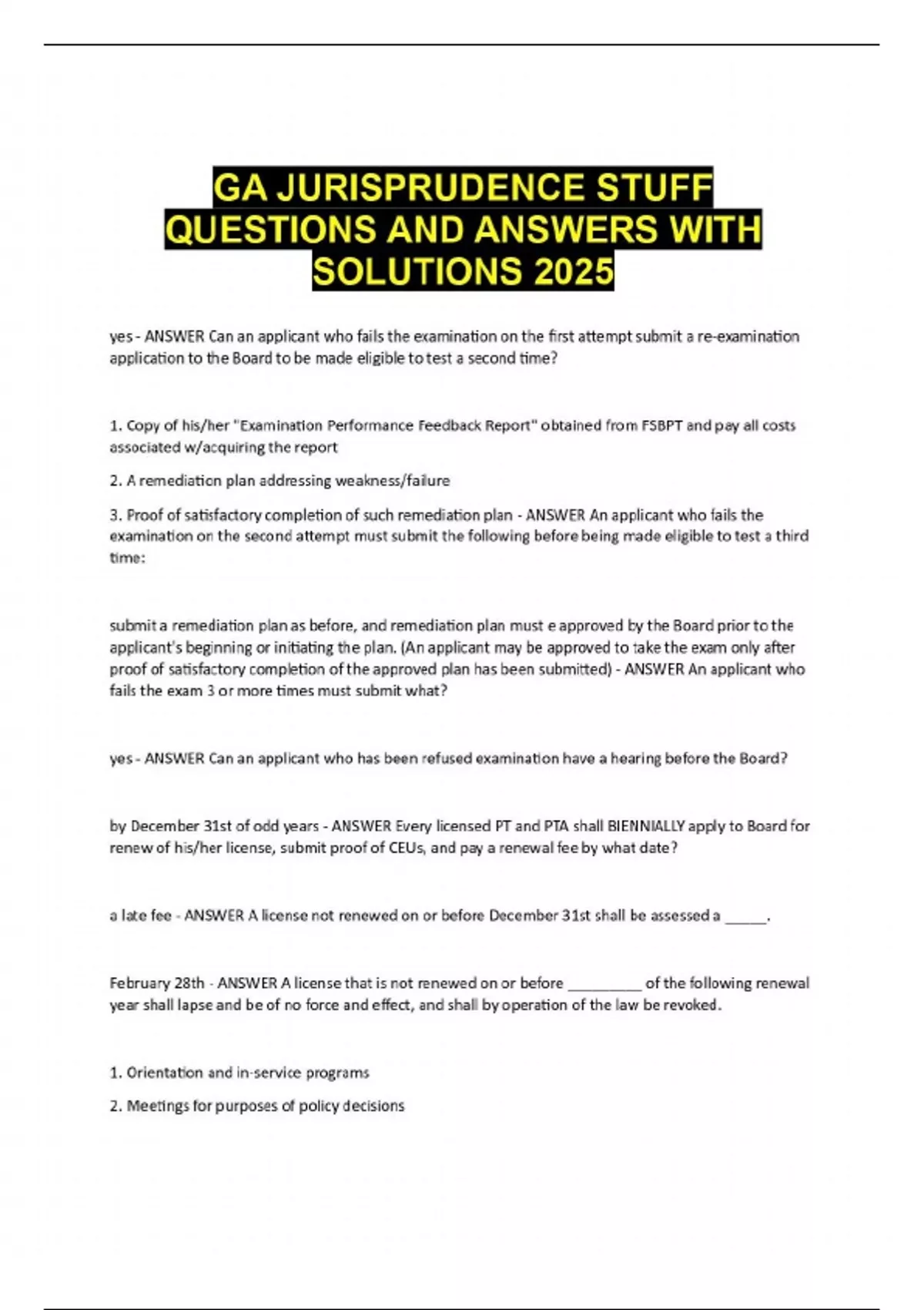 yes - ANSWER Can an applicant who fails the examination on the first attempt submit a re-examination application to the Board to be made eligible to test a second time? 1. Copy of his/her "Examination Performance Feedback Report" obtained from FSBPT and pay all costs associated w/acquiring the report 2. A remediation plan addressing weakness/failure 3. Proof of satisfactory completion of such remediation plan - ANSWER An applicant who fails the examination on the second attempt must submit the following before being made eligible to test a third time: submit a remediation plan as before, and remediation plan must e approved by the Board prior to the applicant's beginning or initiating the plan. (An applicant may be approved to take the exam only after proof of satisfactory completion of the approved plan has been submitted) - ANSWER An applicant who fails the exam 3 or more times must submit what? yes - ANSWER Can an applicant who has been refused examination have a hearing before the Board? by December 31st of odd years - ANSWER Every licensed PT and PTA shall BIENNIALLY apply to Board for renew of his/her license, submit proof of CEUs, and pay a renewal fee by what date? a late fee - ANSWER A license not renewed on or before December 31st shall be assessed a _____. February 28th - ANSWER A license that is not renewed on or before _________ of the following renewal year shall lapse and be of no force and effect, and shall by operation of the law be revoked. 1. Orientation and in-service programs 2.