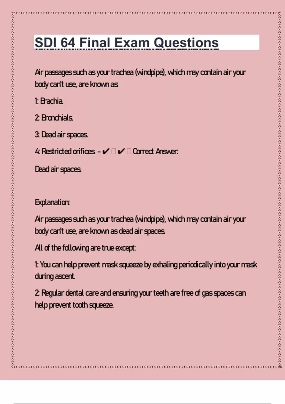 Air passages such as your trachea (windpipe), which may contain air your body can't use, are known as: 1: Brachia. 2: Bronchials. 3: Dead air spaces. 4: Restricted orifices. - ️️Correct Answer: Dead air spaces. Explanation: Air passages such as your trachea (windpipe), which may contain air your body can't use, are known as dead air spaces. All of the following are true except: 1: You can help prevent mask squeeze by exhaling periodically into your mask during ascent. 2: Regular dental care and ensuring your teeth are free of gas spaces can help prevent tooth squeeze. 3: If you experience a reverse block, descend to a point where the pain subsides, then ascend slowly while wiggling your jaw and swallowing. Repeat this process as needed until you can ascend without pain or discomfort. 4: The danger in taking decongestants is that they may wear off during a dive and have other possible side effects. - ️️You can help prevent mask squeeze by exhaling periodically into your mask during ascent.