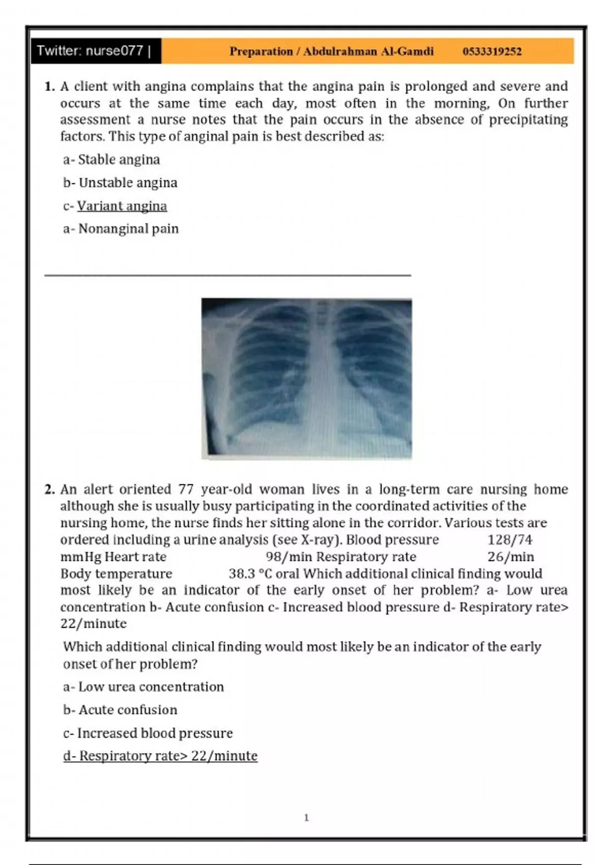 1. A client with angina complains that the angina pain is prolonged and severe and occurs at the same time each day, most often in the morning, On further assessment a nurse notes that the pain occurs in the absence of precipitating factors. This type of anginal pain is best described as: a- Stable angina b- Unstable angina c- Variant angina a- Nonanginal pain