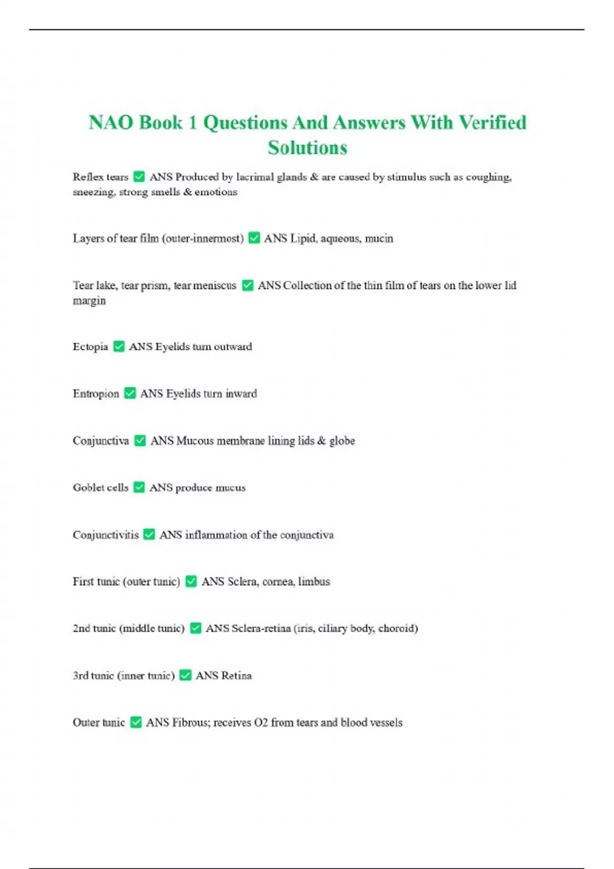 NAO Book 1 Questions And Answers With Verified Solutions Reflex tears ANS Produced by lacrimal glands & are caused by stimulus such as coughing, sneezing, strong smells & emotions Layers of tear film (outer-innermost) ANS Lipid, aqueous, mucin Tear lake, tear prism, tear meniscus ANS Collection of the thin film of tears on the lower lid margin Ectopia ANS Eyelids turn outward Entropion ANS Eyelids turn inward