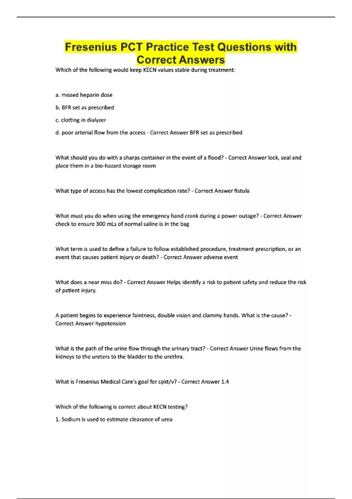 Fresenius PCT Practice Test Questions with Correct Answers Which of the following would keep KECN values stable during treatment: a. missed heparin dose b. BFR set as prescribed c. clotting in dialyzer d. poor arterial flow from the access - Correct Answer BFR set as prescribed What should you do with a sharps container in the event of a flood? - Correct Answer lock, seal and place them in a bio-hazard storage room What type of access has the lowest complication rate? - Correct Answer fistula What must you do when using the emergency hand crank during a power outage? - Correct Answer check to ensure 300 mLs of normal saline is in the bag What term is used to define a failure to follow established procedure, treatment prescription, or an event that causes patient injury or death? - Correct Answer adverse event What does a near miss do? - Correct Answer Helps identify a risk to patient safety and reduce the risk of patient injury. A patient begins to experience faintness, double vision and clammy hands. What is the cause? - Correct Answer hypotension What is the path of the urine flow through the urinary tract? - Correct Answer Urine flows from the kidneys to the ureters to the bladder to the urethra. What is Fresenius Medical Care's goal for spkt/v? - Correct Answer 1.4 Which of the following is correct about KECN testing? 1. Sodium is used to estimate clearance of urea