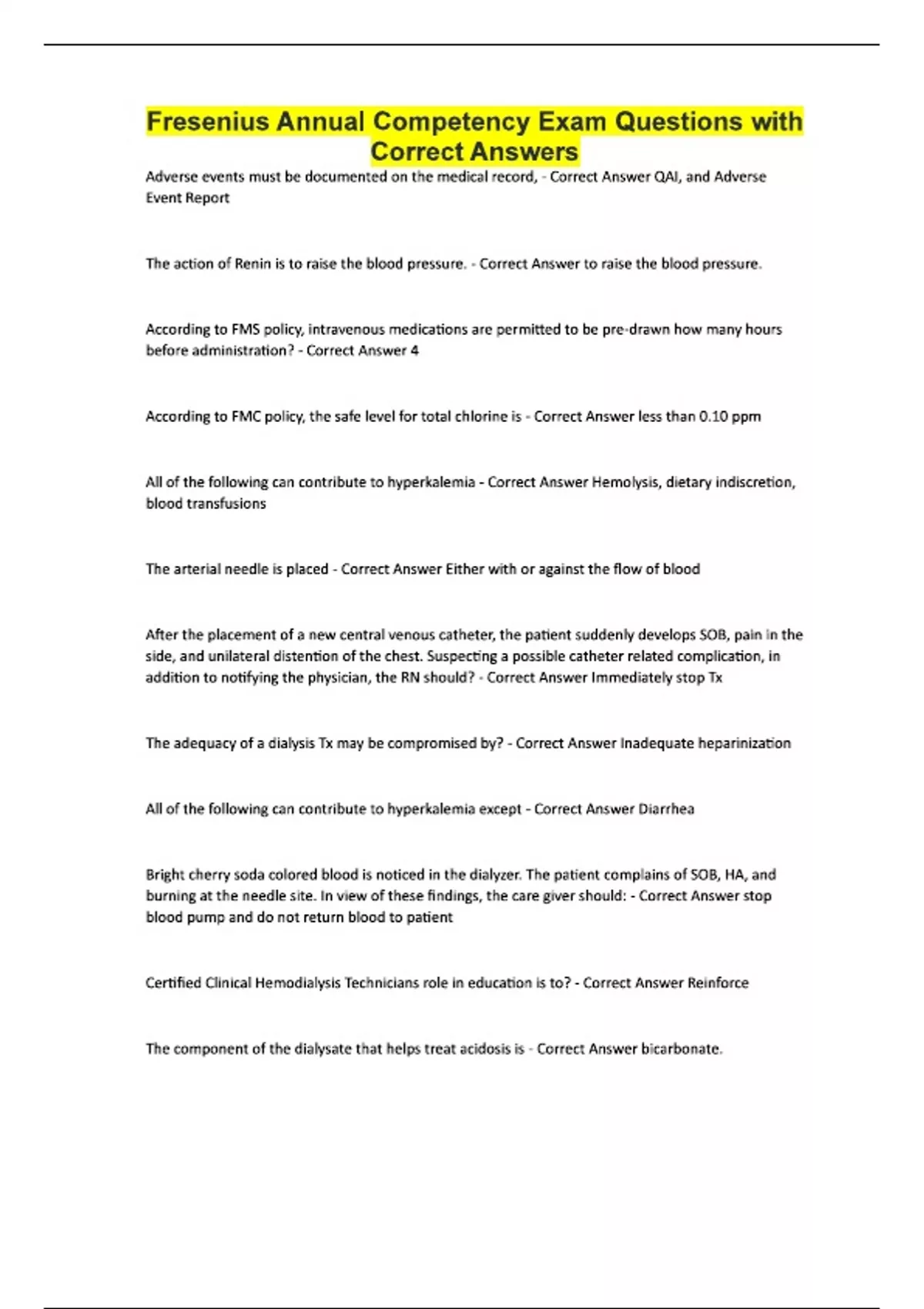 Fresenius Annual Competency Exam Questions with Correct Answers Adverse events must be documented on the medical record, - Correct Answer QAI, and Adverse Event Report The action of Renin is to raise the blood pressure. - Correct Answer to raise the blood pressure. According to FMS policy, intravenous medications are permitted to be pre-drawn how many hours before administration? - Correct Answer 4 According to FMC policy, the safe level for total chlorine is - Correct Answer less than 0.10 ppm All of the following can contribute to hyperkalemia - Correct Answer Hemolysis, dietary indiscretion, blood transfusions The arterial needle is placed - Correct Answer Either with or against the flow of blood After the placement of a new central venous catheter, the patient suddenly develops SOB, pain in the side, and unilateral distention of the chest. Suspecting a possible catheter related complication, in addition to notifying the physician, the RN should? - Correct Answer Immediately stop Tx The adequacy of a dialysis Tx may be compromised by? - Correct Answer Inadequate heparinization All of the following can contribute to hyperkalemia except - Correct Answer Diarrhea Bright cherry soda colored blood is noticed in the dialyzer. The patient complains of SOB, HA, and burning at the needle site. In view of these findings, the care giver should: - Correct Answer stop blood pump and do not return blood to patient Certified Clinical Hemodialysis Technicians role in education is to? - Correct Answer Reinforce The component of the dialysate that helps treat acidosis is - Correct Answer bicarbonate.