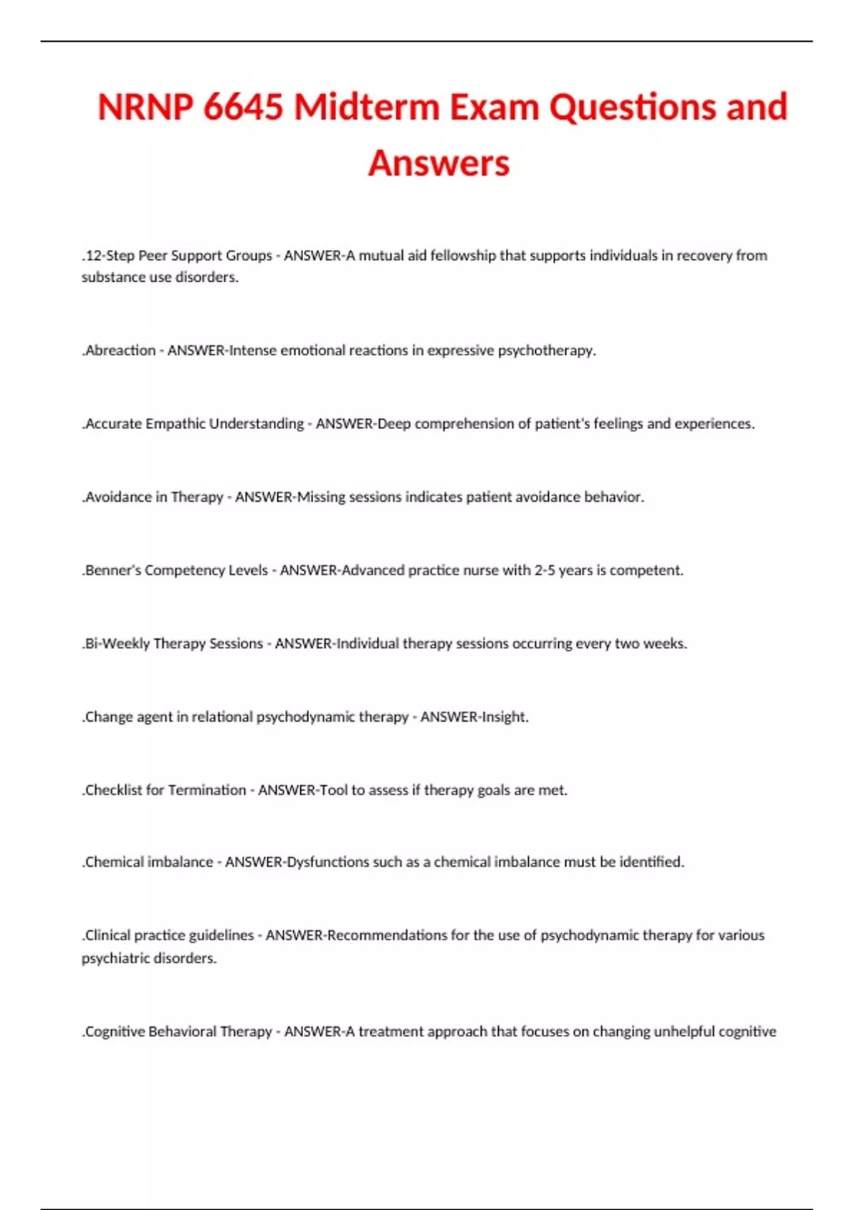NRNP 6645 Midterm Exam Questions and Answers .12-Step Peer Support Groups - ANSWER-A mutual aid fellowship that supports individuals in recovery from substance use disorders. .Abreaction - ANSWER-Intense emotional reactions in expressive psychotherapy. .Accurate Empathic Understanding - ANSWER-Deep comprehension of patient's feelings and experiences. .Avoidance in Therapy - ANSWER-Missing sessions indicates patient avoidance behavior. .Benner's Competency Levels - ANSWER-Advanced practice nurse with 2-5 years is competent. .Bi-Weekly Therapy Sessions - ANSWER-Individual therapy sessions occurring every two weeks. .Change agent in relational psychodynamic therapy - ANSWER-Insight. .Checklist for Termination - ANSWER-Tool to assess if therapy goals are met. .Chemical imbalance - ANSWER-Dysfunctions such as a chemical imbalance must be identified. .Clinical practice guidelines - ANSWER-Recommendations for the use of psychodynamic therapy for various psychiatric disorders. .Cognitive Behavioral Therapy - ANSWER-A treatment approach that focuses on changing unhelpful cognitive distortions and behaviors. .Cognitive distortion example - ANSWER-'If I was in a relationship, all of my problems would be solved' is an example of the Fallacy of attachment. .Cognitive distortion in family therapy - ANSWER-In a family session, the statement 'See they never let me do anything!' is recognized as cognitive distortion known as Overgeneralization. .Cognitive Processing Therapy (CPT) - ANSWER-Therapy focusing on changing negative thought patterns. .Cognitive triad - ANSWER-A concept in CBT that includes maladaptive thoughts rooted in irrational assumptions. .Cognitive-Behavioral Therapy (CBT) - ANSWER-A system of psychotherapy that focuses on how an individual's thoughts influence their feelings and behaviors. .Comorbid PTSD - ANSWER-Presence of PTSD alongside another disorder. .Confluence - ANSWER-A concept in Gestalt therapy where a person merges with others and loses their individuality. .Congruence - ANSWER-Authenticity and transparency in therapist's behavior. .Conscious competency - ANSWER-A stage where a person is aware of their skill or knowledge and can perform it. .Conscious incompetency - ANSWER-A stage where a person is aware of their lack of skill or knowledge. .Coping Strategies - ANSWER-Techniques to manage triggers without reverting to behaviors. .Corrective Emotional Experience - ANSWER-Therapeutic process that heals past emotional wounds. .Corrective recapitulation of the primary family group - ANSWER-The therapeutic value is that early familial conflicts are relived correctively. .Creative experimentation - ANSWER-A therapeutic technique used in Gestalt therapy to explore a patient's experiences and feelings. .Cross-Cultural Research - ANSWER-Culture influences psychiatric disorder definitions. .Cultural framework in relationships - ANSWER-This is a culturally consistent framework where the wife is typically the decision maker in the family. .Cultural syndrome - ANSWER-A group of co-occurring, relatively invariant symptoms found in a specific cultural group, community or context. .Debriefing - ANSWER-Discussion of trauma immediately after an event. .Deflection - ANSWER-A defense mechanism where a person avoids direct confrontation or emotional expression. .Dialectical Behavior Therapy (DBT) - ANSWER-Struggles with homework indicate Stage 1 treatment. .Direct advice - ANSWER-A strategy in imparting information that can elucidate interpersonal pathology. .Directive approach - ANSWER-Learning to be directive to help the patient feel better. .Dynamic supportive therapy - ANSWER-A strategy where the nurse assists the patient with reality testing, problem-solving, and interpersonal awareness. .Dysfunctional Processes - ANSWER-Behaviors developed to meet unmet needs