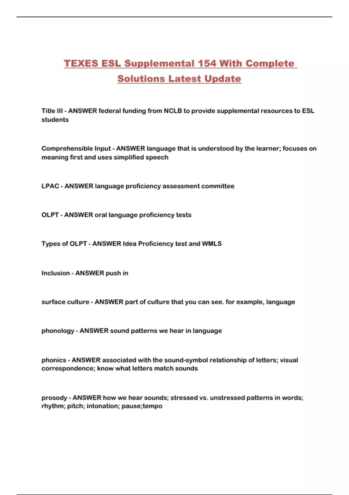 TEXES ESL Supplemental 154 With Complete Solutions Latest Update...