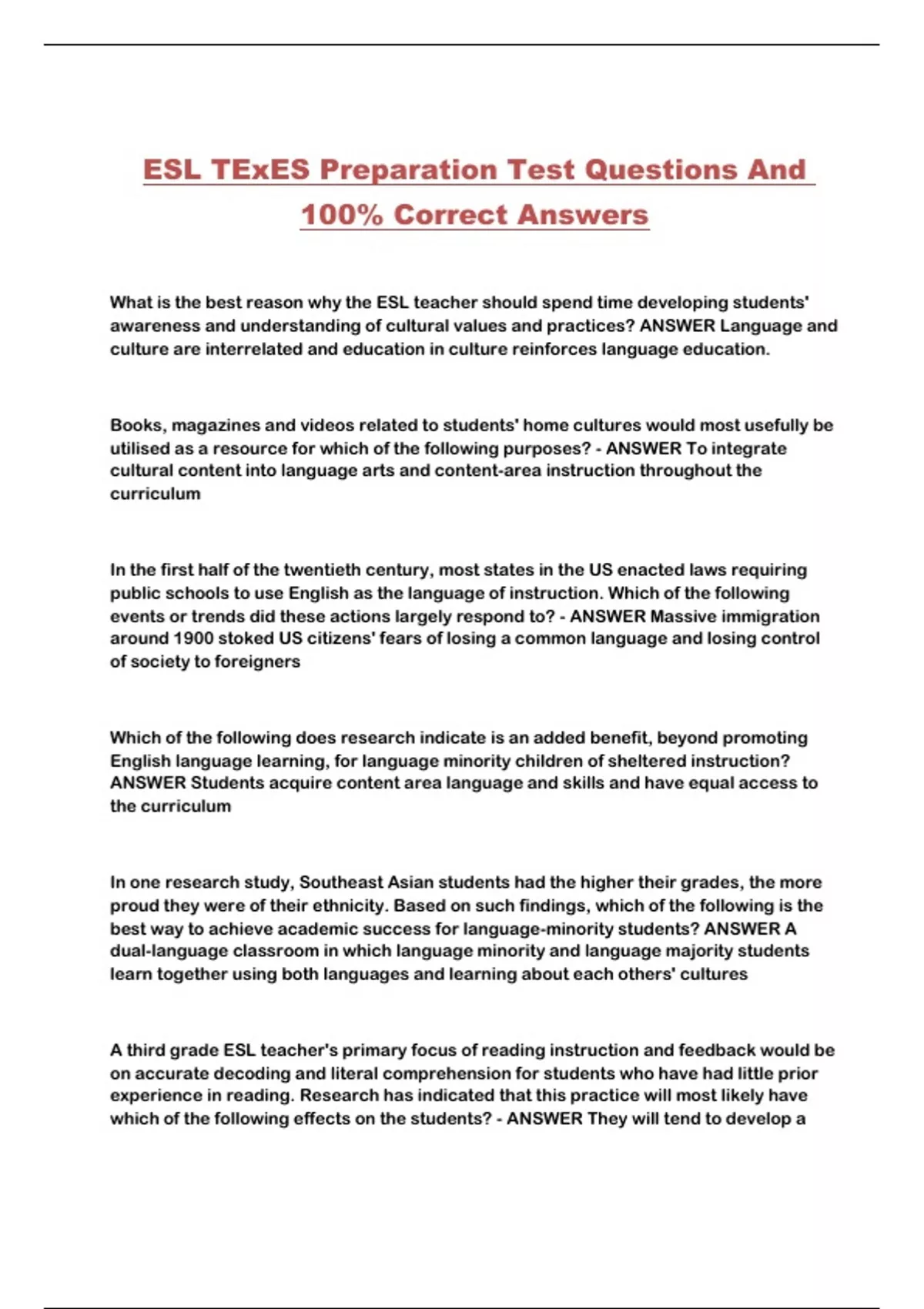 ESL TExES Preparation Test Questions And 100% Correct Answers...