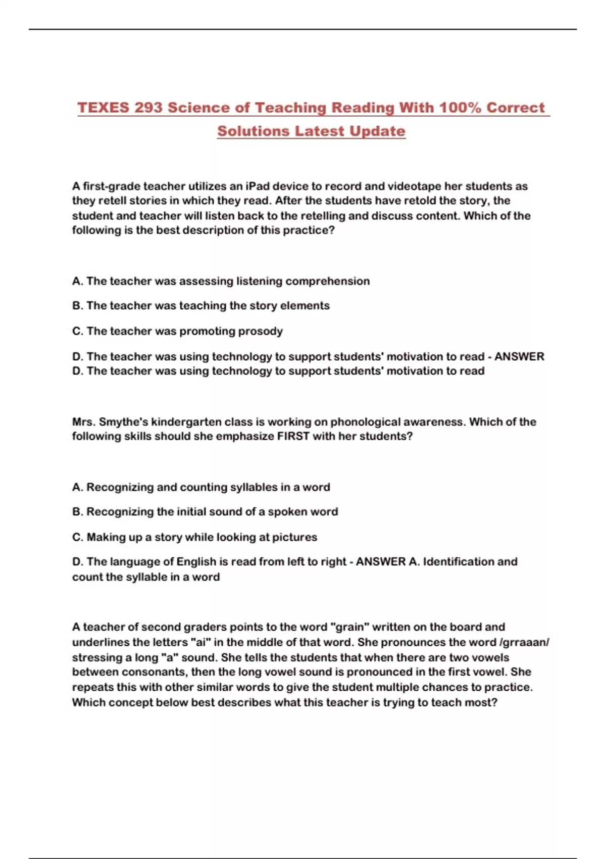 TEXES 293 Science of Teaching Reading With 100% Correct