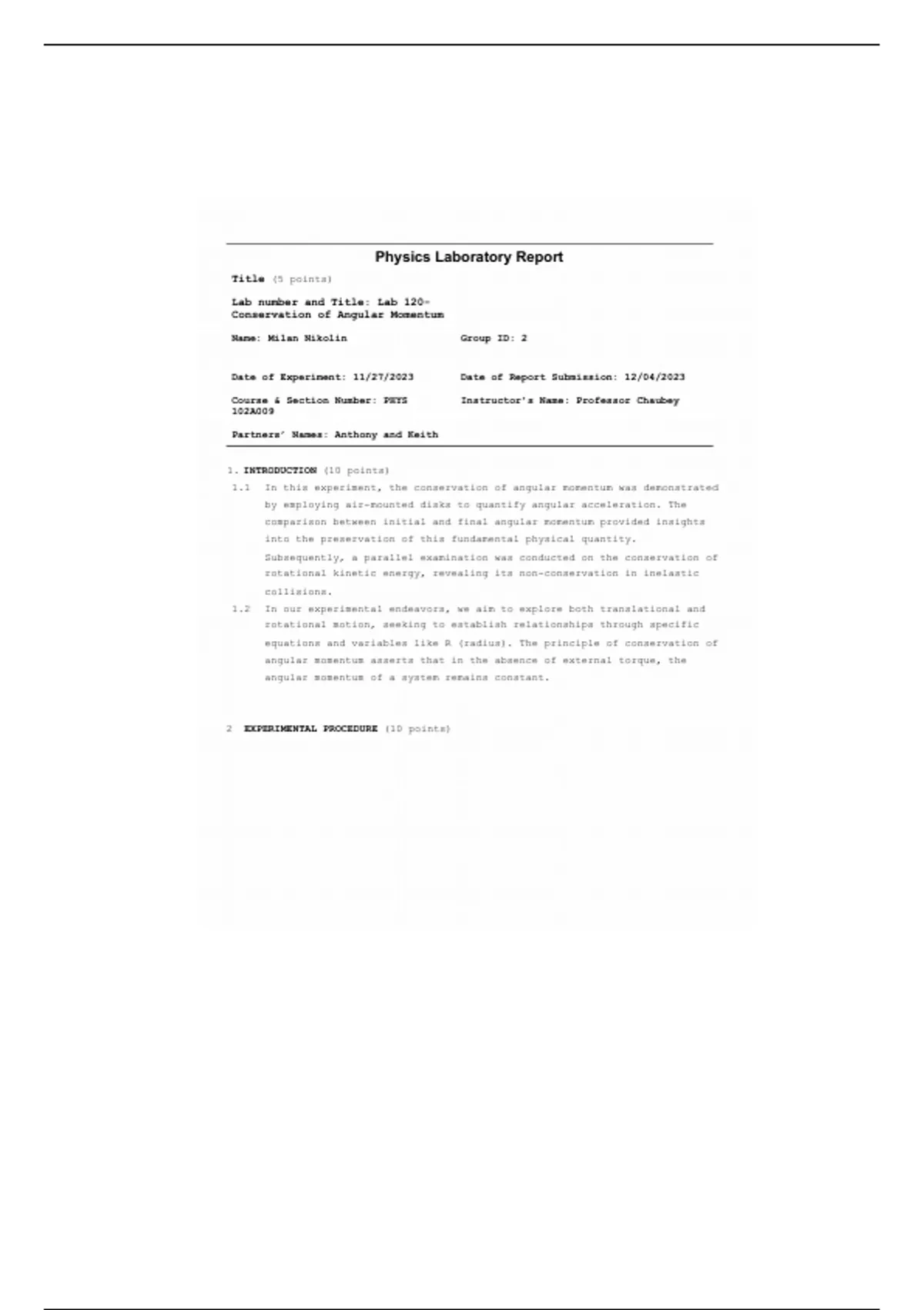2 EXPERIMENTAL PROCEDURE (10 points)