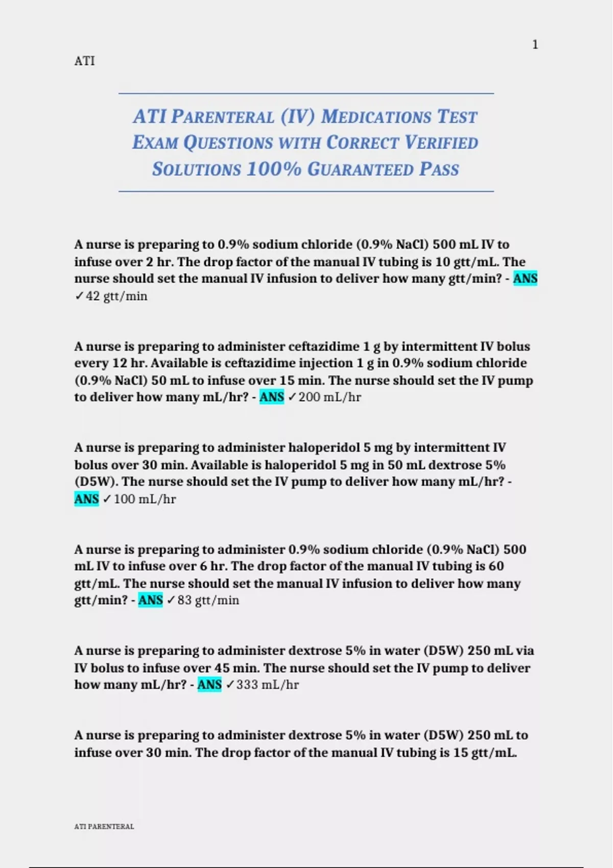 ATI PARENTERAL (IV) MEDICATIONS TEST