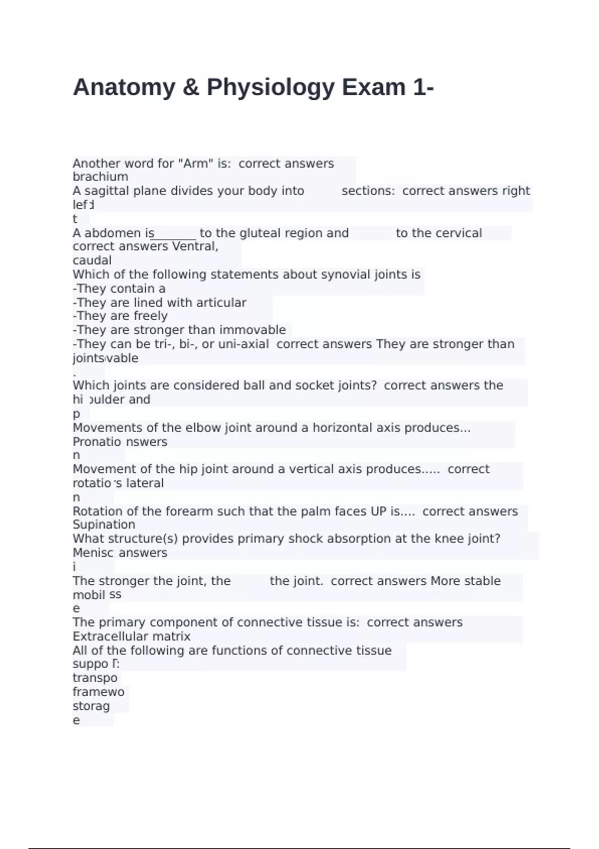 Another word for "Arm" is: correct answers brachium A sagittal plane divides your body into _________ sections: correct answers right and left A abdomen is _______ to the gluteal region and _________ to the cervical region. correct answers Ventral, caudal Which of the following statements about synovial joints is FALSE? -They contain a space -They are lined with articular cartilage -They are freely movable -They are stronger than immovable joints -They can be tri-, bi-, or uni-axial correct answers They are stronger than immovable joints. Which joints are considered ball and socket joints? correct answers the shoulder and hip Movements of the elbow joint around a horizontal axis produces... correct answers Pronation Movement of the hip joint around a vertical axis produces..... correct answers lateral rotation Rotation of the forearm such that the palm faces UP is.... correct answers Supination What structure(s) provides primary shock absorption at the knee joint? correct answers Menisci The stronger the joint, the ________ the joint. correct answers More stable and less mobile The primary component of connective tissue is: correct answers Extracellular matrix All of the following are functions of connective tissue EXCEPT: support transport framework storage