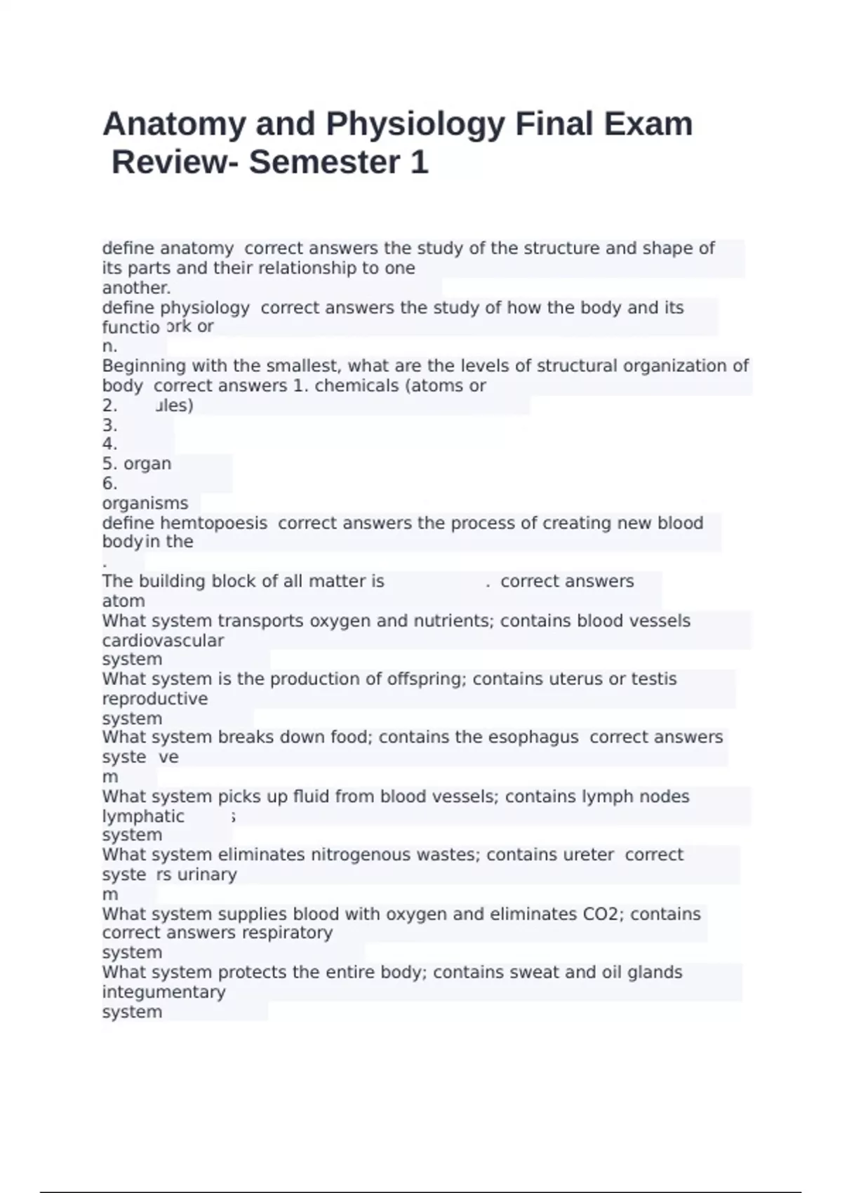 define anatomy correct answers the study of the structure and shape of the body and its parts and their relationship to one another. define physiology correct answers the study of how the body and its parts work or function. Beginning with the smallest, what are the levels of structural organization of the human body correct answers 1. chemicals (atoms or molecules) 2. cells 3. tissues 4. organs 5. organ systems 6. organisms define hemtopoesis correct answers the process of creating new blood cells in the body. The building block of all matter is ______________. correct answers atom What system transports oxygen and nutrients; contains blood vessels correct answers cardiovascular system What system is the production of offspring; contains uterus or testis correct answers reproductive system What system breaks down food; contains the esophagus correct answers digestive system What system picks up fluid from blood vessels; contains lymph nodes correct answers lymphatic system What system eliminates nitrogenous wastes; contains ureter correct answers urinary system What system supplies blood with oxygen and eliminates CO2; contains the lungs correct answers respiratory system What system protects the entire body; contains sweat and oil glands correct answers integumentary system