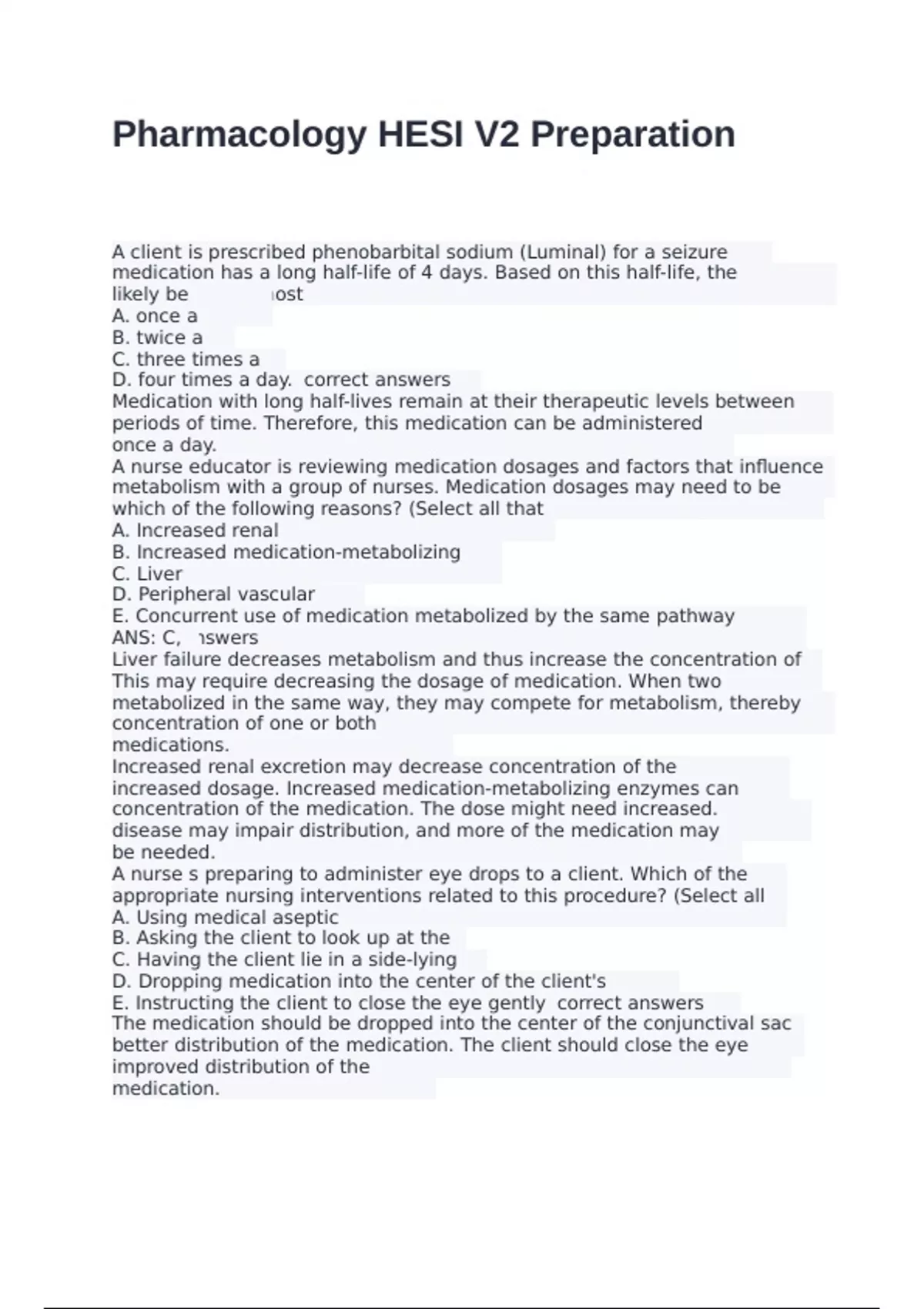 A client is prescribed phenobarbital sodium (Luminal) for a seizure disorder. The medication has a long half-life of 4 days. Based on this half-life, the medication will most likely be prescribed A. once a day. B. twice a day. C. three times a day. D. four times a day. correct answers ANS: A Medication with long half-lives remain at their therapeutic levels between doses for long periods of time. Therefore, this medication can be administered once a day. A nurse educator is reviewing medication dosages and factors that influence medication metabolism with a group of nurses. Medication dosages may need to be decreased for which of the following reasons? (Select all that apply.) A. Increased renal excretion B. Increased medication-metabolizing enzymes C. Liver failure D. Peripheral vascular disease E. Concurrent use of medication metabolized by the same pathway correct answers ANS: C, E Liver failure decreases metabolism and thus increase the concentration of medication. This may require decreasing the dosage of medication. When two medications are metabolized in the same way, they may compete for metabolism, thereby increasing the concentration of one or both medications. Increased renal excretion may decrease concentration of the medication, requiring increased dosage. Increased medication-metabolizing enzymes can decrease the concentration of the medication. The dose might need increased. Peripheral vascular disease may impair distribution, and more of the medication may be needed. A nurse s preparing to administer eye drops to a client. Which of the following are appropriate nursing interventions related to this procedure? (Select all that apply.) A. Using medical aseptic technique B. Asking the client to look up at the ceiling C. Having the client lie in a side-lying position D. Dropping medication into the center of the client's conjunctival sac E. Instructing the client to close the eye gently correct answers ANS:B, D, E The medication should be dropped into the center of the conjunctival sac to promote better distribution of the medication. The client should close the eye gently to allow improved distribution of the medication.