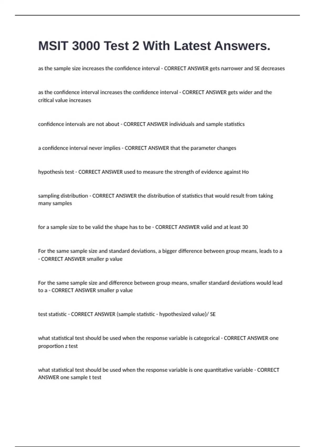 MSIT 3000 Test 2 With Latest Answers. as the sample size increases the confidence interval - CORRECT ANSWER gets narrower and SE decreases as the confidence interval increases the confidence interval - CORRECT ANSWER gets wider and the critical value increases confidence intervals are not about - CORRECT ANSWER individuals and sample statistics a confidence interval never implies - CORRECT ANSWER that the parameter changes hypothesis test - CORRECT ANSWER used to measure the strength of evidence against Ho sampling distribution - CORRECT ANSWER the distribution of statistics that would result from taking many samples for a sample size to be valid the shape has to be - CORRECT ANSWER valid and at least 30 For the same sample size and standard deviations, a bigger difference between group means, leads to a - CORRECT ANSWER smaller p value For the same sample size and difference between group means, smaller standard deviations would lead to a - CORRECT ANSWER smaller p value test statistic - CORRECT ANSWER (sample statistic - hypothesized value)/ SE what statistical test should be used when the response variable is categorical - CORRECT ANSWER one proportion z test