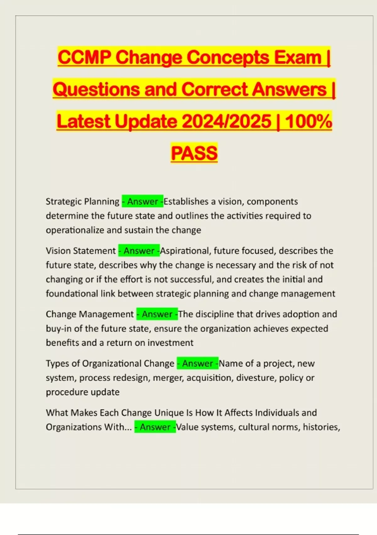 CCMP Change Concepts Exam | Questions and Correct Answers | Latest Update 2024/2025 | 100% PASS