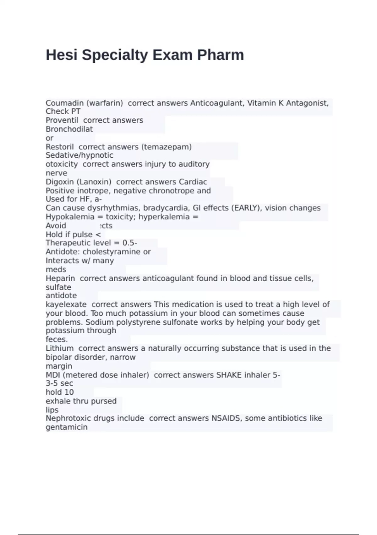 Coumadin (warfarin) correct answers Anticoagulant, Vitamin K Antagonist, Check PT Proventil correct answers Albuterol Bronchodilator Restoril correct answers (temazepam) Sedative/hypnotic otoxicity correct answers injury to auditory nerve Digoxin (Lanoxin) correct answers Cardiac glycoside Positive inotrope, negative chronotrope and dromotrope Used for HF, a-fib Can cause dysrhythmias, bradycardia, GI effects (EARLY), vision changes (EARLY) Hypokalemia = toxicity; hyperkalemia = decreased effects Avoid verapamil Hold if pulse 60 Therapeutic level = 0.5-2.0ng/mL Antidote: cholestyramine or Digibind Interacts w/ many meds Heparin correct answers anticoagulant found in blood and tissue cells, protamine sulfate antidote kayelexate correct answers This medication is used to treat a high level of potassium in your blood. Too much potassium in your blood can sometimes cause heart rhythm problems. Sodium polystyrene sulfonate works by helping your body get rid of extra potassium through feces. Lithium correct answers a naturally occurring substance that is used in the treatment of bipolar disorder, narrow margin MDI (metered dose inhaler) correct answers SHAKE inhaler 5-6 times 3-5 sec inhale hold 10 sec exhale thru pursed lips Nephrotoxic drugs include correct answers NSAIDS, some antibiotics like gentamicin
