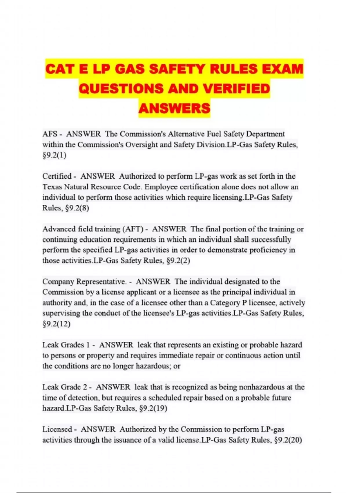 CAT E LP GAS SAFETY RULES EXAM QUESTIONS AND VERIFIED ANSWERS...