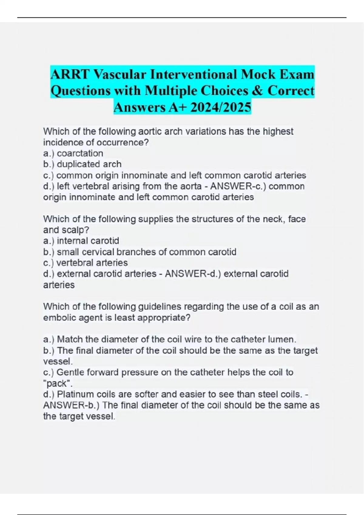ARRT Vascular Interventional Mock Exam Questions with Multiple Choices & Correct Answers A+ 2024/2025 Which of the following aortic arch variations has the highest incidence of occurrence? a.) coarctation b.) duplicated arch c.) common origin innominate and left common carotid arteries d.) left vertebral arising from the aorta - ANSWER-c.) common origin innominate and left common carotid arteries Which of the following supplies the structures of the neck, face and scalp? a.) internal carotid b.) small cervical branches of common carotid c.) vertebral arteries d.) external carotid arteries - ANSWER-d.) external carotid arteries Which of the following guidelines regarding the use of a coil as an embolic agent is least appropriate? a.) Match the diameter of the coil wire to the catheter lumen. b.) The final diameter of the coil should be the same as the target vessel. c.) Gentle forward pressure on the catheter helps the coil to "pack". d.) Platinum coils are softer and easier to see than steel coils. - ANSWER-b.) The final diameter of the coil should be the same as the target vessel. A device that is used to deliver a bolus of contrast medium to a specific site during angiography or other radiological procedures is known as which of the following? a.) Catheter b.) Port c.) Stent d.) Line. - ANSWER-a.) catheter The access indicated only when the thoracic veins and the infrarenal inferior vena cava are occluded is which of the following? a.) subclavian vein b.) upper extremity veins c.) transhepatic access d.) translumbar access - ANSWER-c.) transhepatic access The embolic agent that is supplied in small sterile bricks or a fine powder, is compressible, and is absorbed over a period of 4-6 weeks is which of the following? a.) autologous clot b.) vascular plug c.) gelfoam d.) polyvinyl alcohol - ANSWER-c.) gelfoam Peripherally inserted central catheter line placement guidelines would include all of the following EXCEPT: a.) surgical arm prep b.) basilic or cephalic vein preferred c.) access vein with micro puncture needle d.) tip of catheter should be in low left atrium - ANSWER-d.) tip of catheter should be in low left atrium Dissections are the most common with which type of guidewire? a.) Terumo b.) Rosen c.) Straight d.) 3J. - ANSWER-c. straight An arrangement of columns or rows of cells, or pixels, forming a digital image is called a(n): a.) image matrix b.) dynamic range c.) digital image subtraction d.) data range - ANSWER-a.) image matrix Which of the following types of catheters has the lowest coefficient of friction? a.) Polyethylene. b.) Teflon. c.) Polyurethane. d.) Plastic. - ANSWER-b.) Teflon Which type of guidewire is used for tortuous and diseased veins? a.) Straight wire b.) Rosen c.) Amplatz stiff d.) 3J - ANSWER-d.) 3J Which of the following is a classification of stents that are the most flexible, but can "shingle" or "fish scale" when deployed in tight curves? a.) open-celled b.) closed-celled c.) drug-eluting d.) expandable - ANSWER-a.) open-celled How long are central venous catheters left in the patient's body? a.) Several weeks or longer b.) One week or less c.) Two days or less d.) Under 1 hour. - ANSWER-a.) several weeks or longer Which of the following ranges of blood pressure values in an adult at rest is considered to be stage 1 hypertension? a.) 120/80 mm Hg or less b.) 120/80 mm Hg or greater c.) 140/90 mm Hg or greater d.) 130/80 mm Hg or greater - ANSWER-d.) 130/80 mm Hg or greater Hypertension increases the risk of: a.) bleeding b.) hematoma c.) anaphylaxis d.) myocardial infarction - ANSWER-b.) hematoma Which of the following is the normal range for hematocrit in adult females? a.) 54.8-67.2% b.) 38.8-50% c.) 22.4-36.5% d.) 36-48% - ANSWER-d.) 36-48% Which of the following ranges of blood pressure values in an adult at rest is considered to be stage 1 hypertension? a.) 140 or higher systolic or 90 or higher diastolic. b.) 130-139 systolic or 80-89 diastolic. c.) Less than 120/80 mm Hg. d.) 120-129 systolic or less than 80. - ANSWER-b.) 130-139 systolic or 80-89 diastolic. The degree of blackening or opacity of an area in a radiograph due to the accumulation of black metallic silver following exposure and processing of a film is the: a.) image media b.) shade of contrast c.) density d.) brightness - ANSWER-c.) density Most interventional radiologists will not do a procedure until the patient has an international normalization ratio (INR) of: a.) 1.6 or below b.) 1.8 or below c.) 2.6 or below d.) 2.8 or below - ANSWER-a.) 1.6 or below During a post-procedure check, a doctor would do all of the following EXCEPT: Continues...