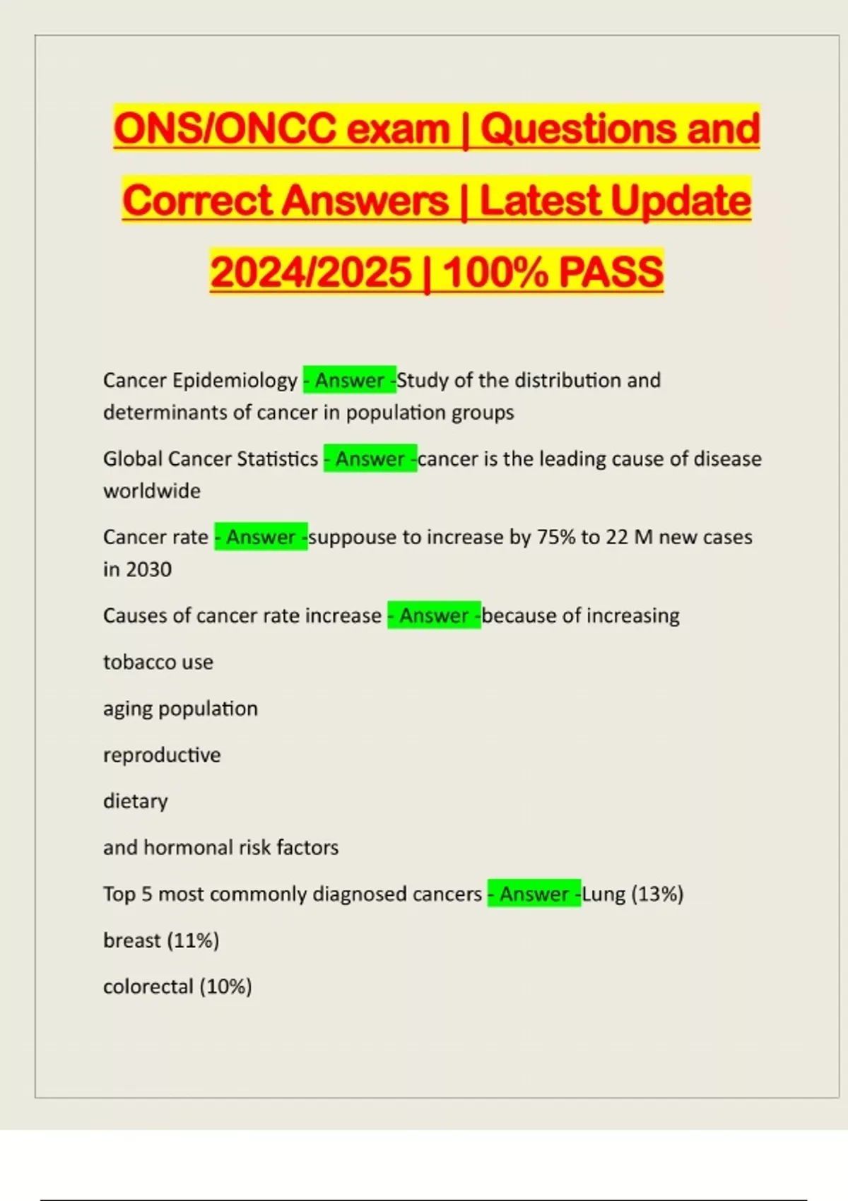 ONS/ONCC exam | Questions and Correct Answers | Latest Update 2024/2025 | 100% PASS Cancer Epidemiology - Answer -Study of the distribution and determinants of cancer in population groups Global Cancer Statistics - Answer -cancer is the leading cause of disease worldwide Cancer rate - Answer -suppouse to increase by 75% to 22 M new cases in 2030 Causes of cancer rate increase - Answer -because of increasing tobacco use aging population reproductive dietary and hormonal risk factors Top 5 most commonly diagnosed cancers - Answer -Lung (13%) breast (11%) colorectal (10%)stomach (8%) prostate (7%) Make up 50 % of all cancer diagnosed - Answer -Lung breast colorectal stomach prostate