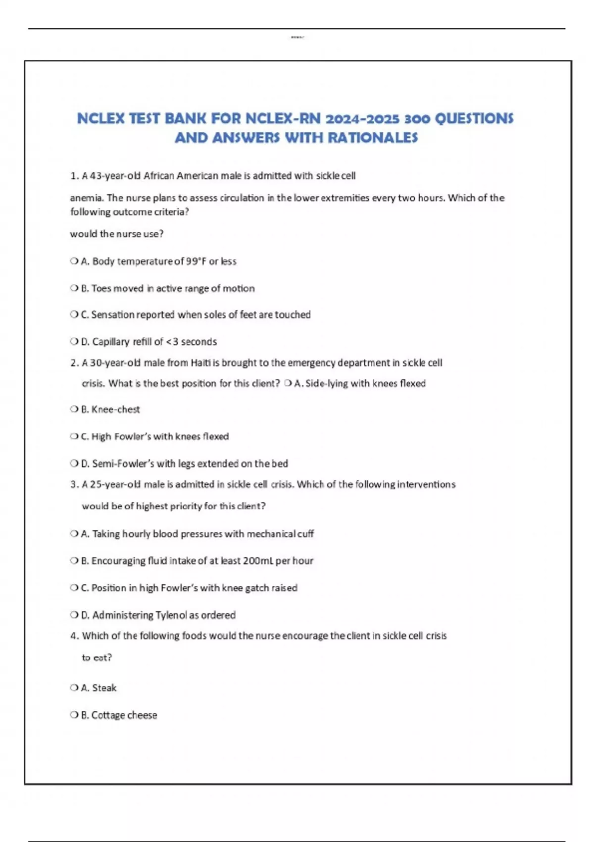 NCLEX TEST BANK FOR NCLEX-RN QUESTIONS AND ANSWERS WITH RATIONALES 1. A 43-year-old African American male is admitted with sickle cell anemia. The nurse plans to assess circulation in the lower extremities every two hours. Which of the following outcome criteria? would the nurse use? A. Body temperature of 99°F or less B. Toes moved in active range of motion C. Sensation reported when soles of feet are touched D. Capillary refill of < 3 seconds 2. A 30-year-old male from Haiti is brought to the emergency department in sickle cell crisis. What is the best position for this client? A. Side-lying with knees flexed B. Knee-chest C. High Fowler’s with knees flexed D. Semi-Fowler’s with legs extended on the bed 3. A 25-year-old male is admitted in sickle cell crisis. Which of the following interventions would be of highest priority for this client? A. Taking hourly blood pressures with mechanical cuff B. Encouraging fluid intake of at least 200mL per hour C. Position in high Fowler’s with knee gatch raised D. Administering Tylenol as ordered 4. Which of the following foods would the nurse encourage the client in sickle cell crisis to eat? A. Steak B. Cottage cheese lOMoARcPSD| C. Popsicle D. Lima beans Quick Answer: 223 Detailed Answer: 225 Quick Answer: 223 Detailed Answer: 225 Quick Answer: 223 Detailed Answer: 225 Quick Answer: 223 Detailed Answer: 225 Quick Check 170 Chapter 3 5. A newly admitted client has sickle cell crisis. He is complaining of pain in his feet and hands. The nurse’s assessment findings include a pulse oximetry of 92. Assuming that all the following interventions are ordered, which should be done first? A. Adjust the room temperature B. Give a bolus of IV fluids C. Start O 2 D. Administer meperidine (Demerol) 75mg IV push 6. The nurse is instructing a client with iron-deficiency anemia. Which of the following meal plans would the nurse expect the client to select? A. Roast beef, gelatin salad, green beans, and peach pie B. Chicken salad sandwich, coleslaw, French fries, ice cream lOMoARcPSD| C. Egg salad on wheat bread, carrot sticks, lettuce salad, raisin pie D. Pork chop, creamed potatoes, corn, and coconut cake 7. Clients with sickle cell anemia are taught to avoid activities that cause hypoxia and hypoxemia. Which of the following activities would the nurse recommend? A. A family vacation in the Rocky Mountains B. Chaperoning the local boys club on a snow-skiing trip C. Traveling by airplane for business trips D. A bus trip to the Museum of Natural History 8. The nurse is conducting an admission assessment of a client with vitamin B12 deficiency. Which finding reinforces the diagnosis of B12 deficiency? A. Enlarged spleen B. Elevated blood pressure C. Bradycardia D. Beefy tongue 9. The body part that would most likely display jaundice in the darkskinned individual is the: A. Conjunctiva of the eye B. Soles of the feet C. Roof of the mouth D. Shins Quick Check Quick Answer: 223 Detailed Answer: 225