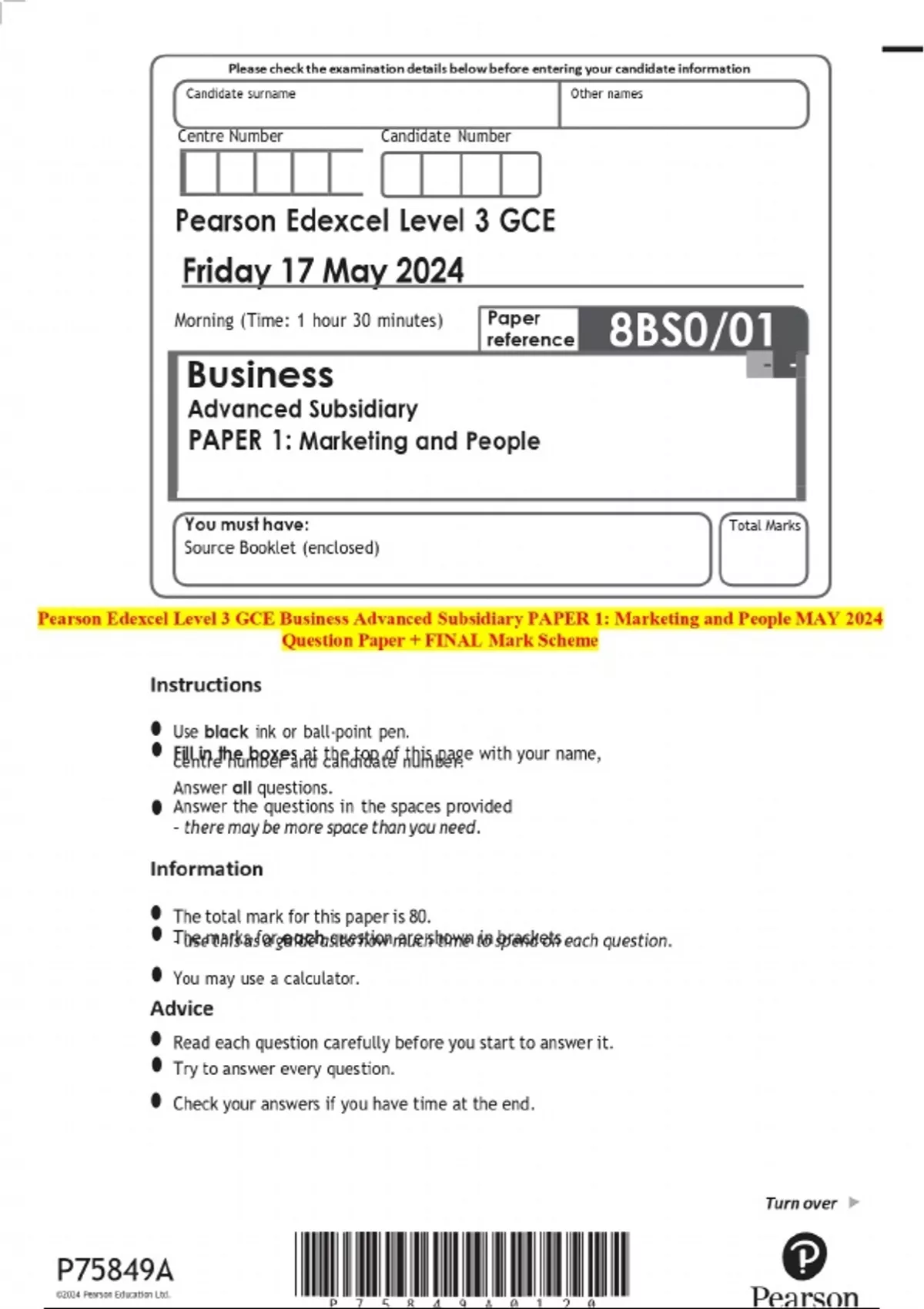 Pearson Edexcel Level 3 GCE Business Advanced Subsidiary PAPER 1: Marketing and People MAY 2024 Question Paper + FINAL Mark Scheme