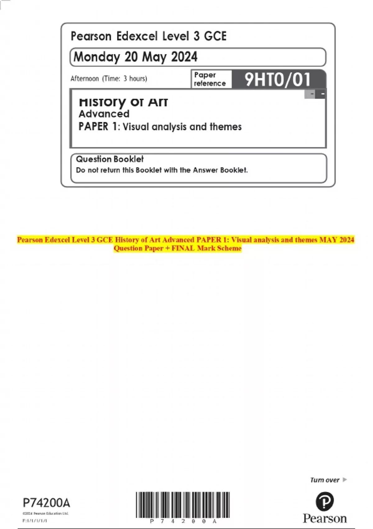 Pearson Edexcel Level 3 GCE History of Art Advanced PAPER 1: Visual analysis and themes MAY 2024 Question Paper + FINAL Mark Scheme