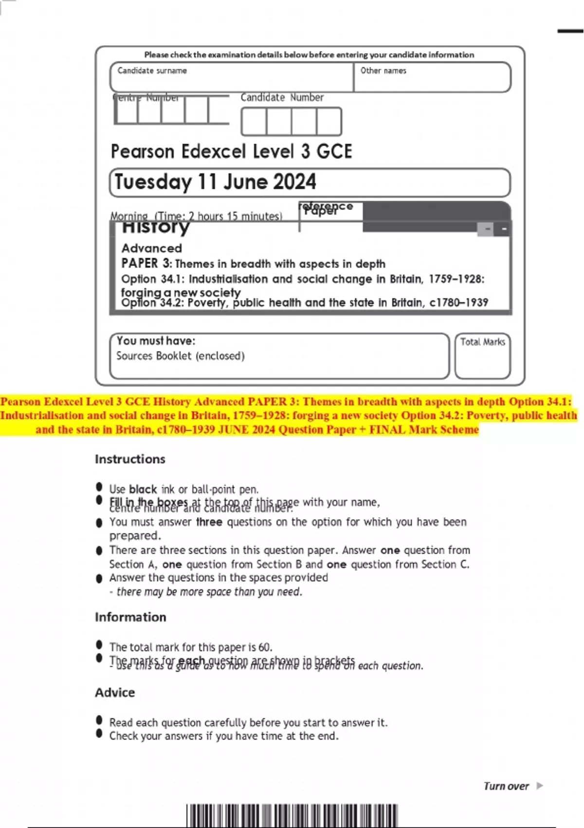 Pearson Edexcel Level 3 GCE History Advanced PAPER 3: Themes in breadth with aspects in depth Option 34.1: Industrialisation and social change in Britain, 1759–1928: forging a new society Option 34.2: Poverty, public health and the state in Britain, c1780–1939 JUNE 2024 Question Paper + FINAL Mark Scheme