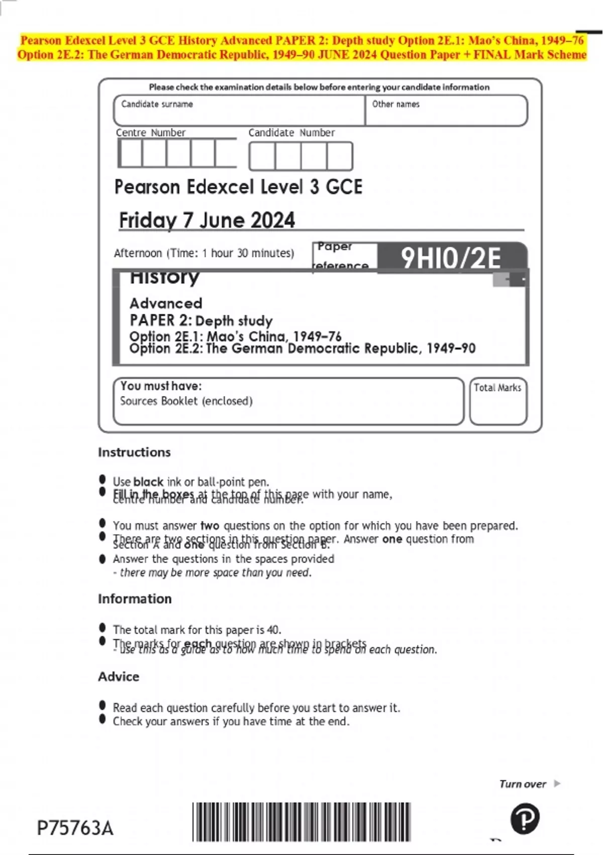Pearson Edexcel Level 3 GCE History Advanced PAPER 2: Depth study Option 2E.1: Mao’s China, 1949–76 Option 2E.2: The German Democratic Republic, 1949–90 JUNE 2024 Question Paper + FINAL Mark Scheme