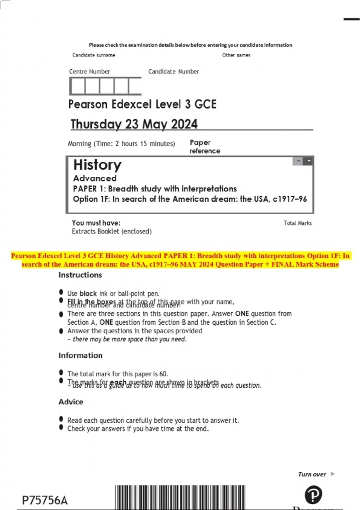 Pearson Edexcel Level 3 GCE History Advanced PAPER 1: Breadth study with interpretations Option 1F: In search of the American dream: the USA, c1917–96 MAY 2024 Question Paper + FINAL Mark Scheme