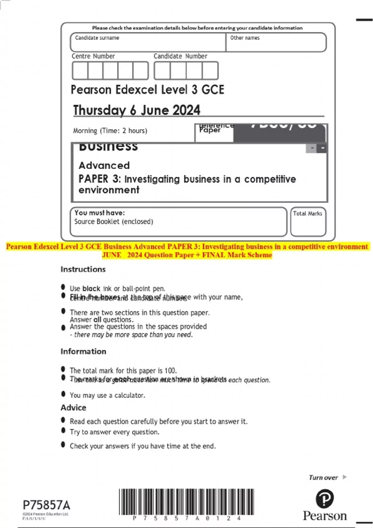 Pearson Edexcel Level 3 GCE Business Advanced PAPER 3: Investigating business in a competitive environment JUNE 2024 Question Paper + FINAL Mark Scheme