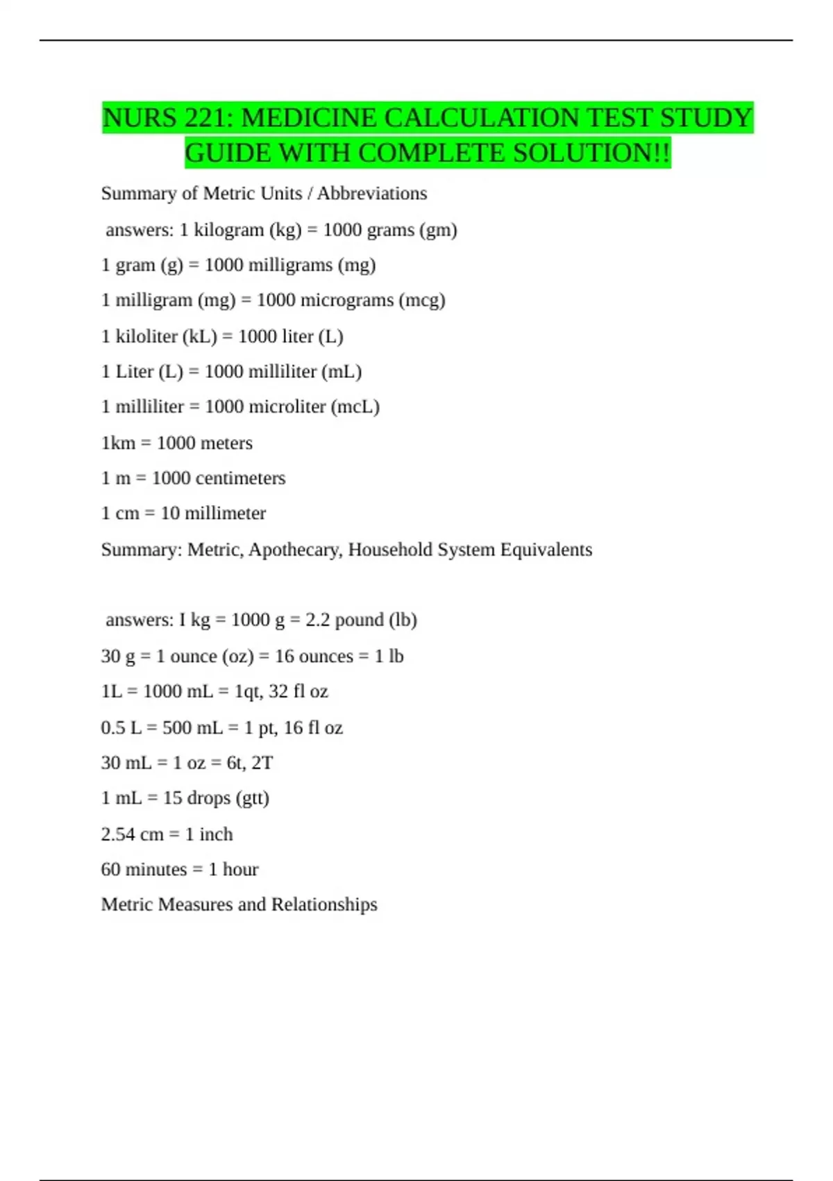 NURS 221: MEDICINE CALCULATION TEST STUDY GUIDE WITH COMPLETE SOLUTION!!