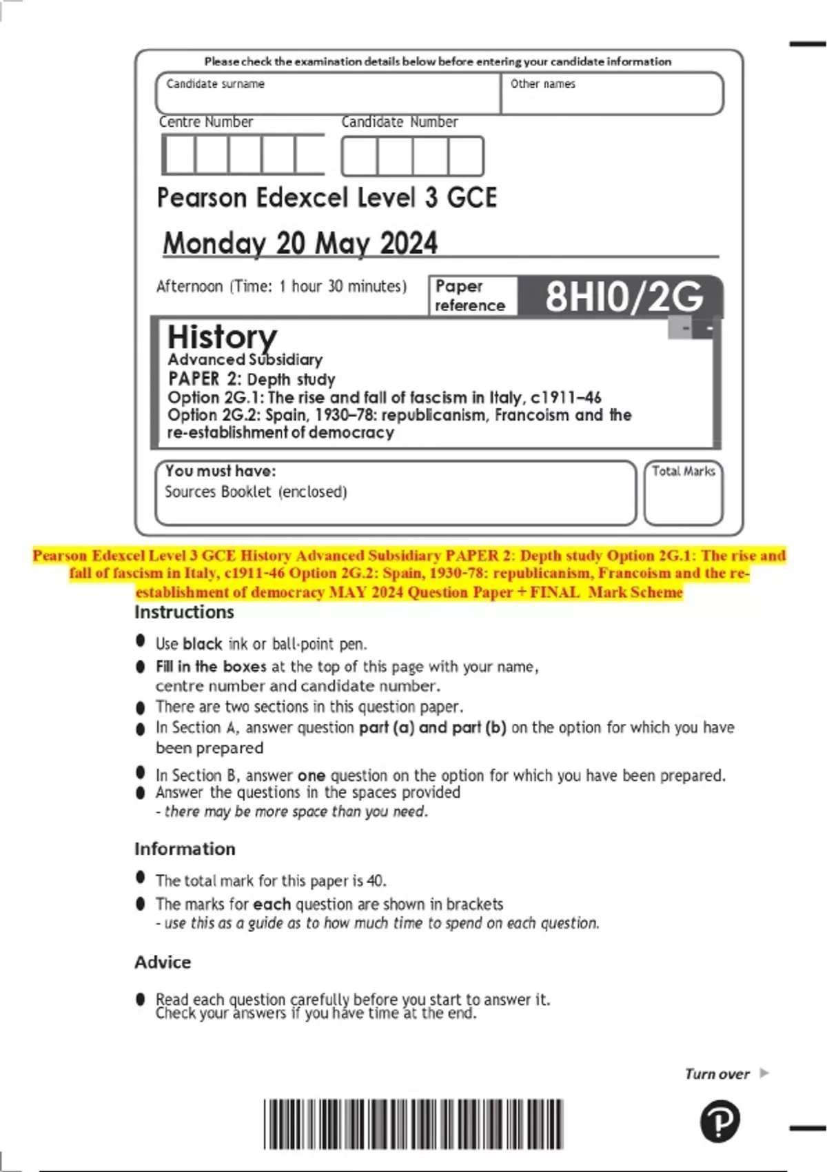Pearson Edexcel Level 3 GCE History Advanced Subsidiary PAPER 2: Depth study Option 2G.1: The rise and fall of fascism in Italy, c1911–46 Option 2G.2: Spain, 1930–78: republicanism, Francoism and the re- establishment of democracy MAY 2024 Question Paper + FINAL Mark Scheme