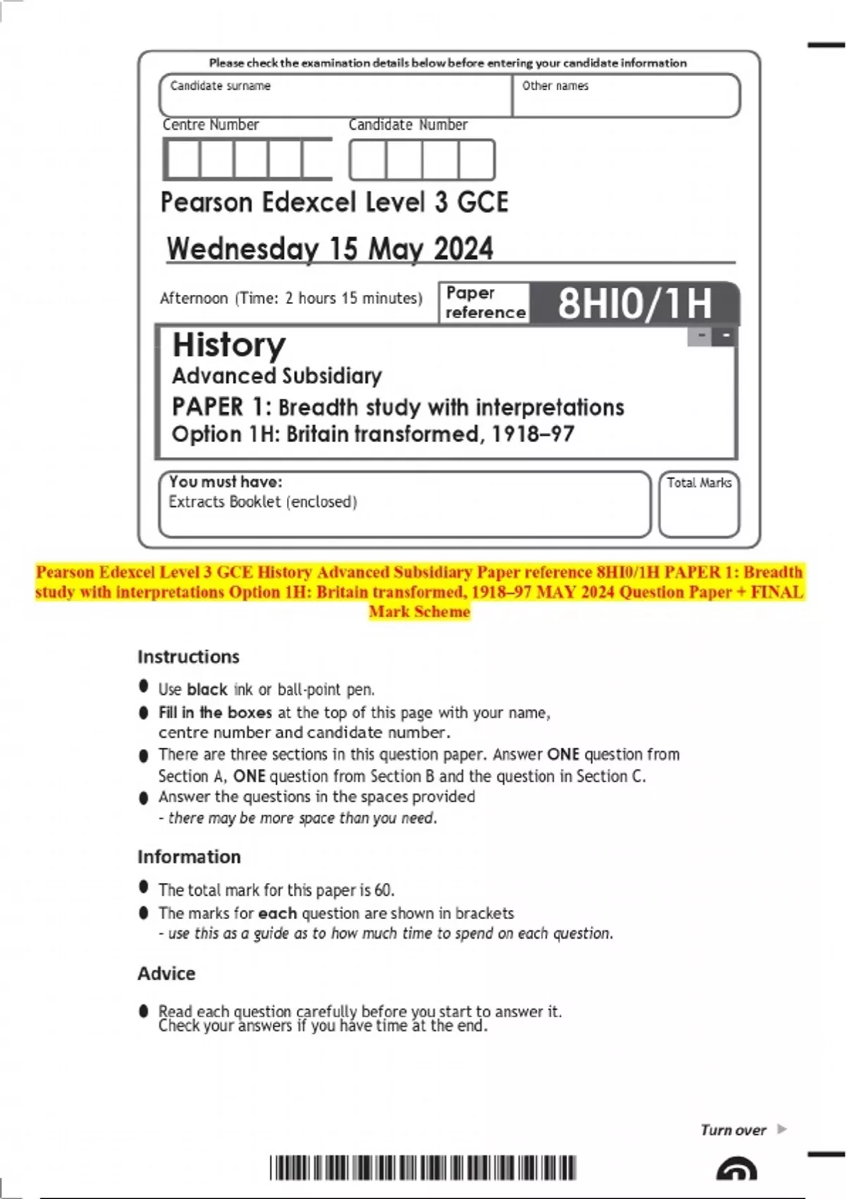 Pearson Edexcel Level 3 GCE History Advanced Subsidiary Paper reference 8HI0/1H PAPER 1: Breadth study with interpretations Option 1H: Britain transformed, 1918–97 MAY 2024 Question Paper + FINAL Mark Scheme
