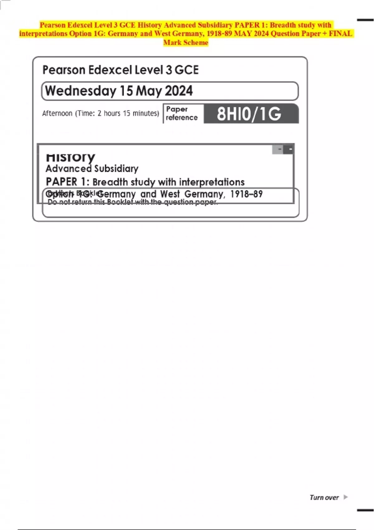 Pearson Edexcel Level 3 GCE History Advanced Subsidiary PAPER 1: Breadth study with interpretations Option 1G: Germany and West Germany, 1918–89 MAY 2024 Question Paper + FINAL Mark Scheme