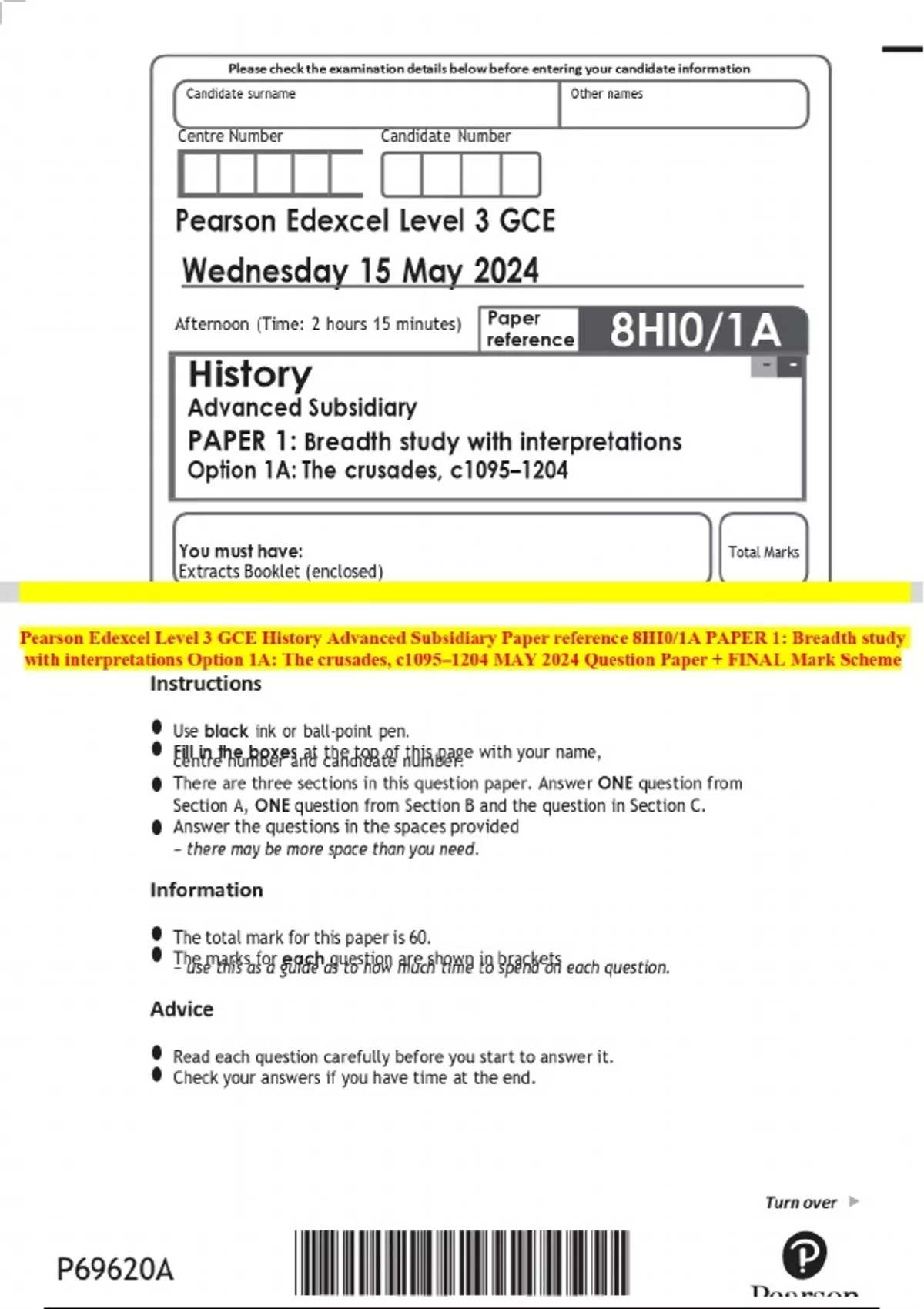 Pearson Edexcel Level 3 GCE History Advanced Subsidiary Paper reference 8HI0/1A PAPER 1: Breadth study with interpretations Option 1A: The crusades, c1095–1204 MAY 2024 Question Paper + FINAL Mark Scheme