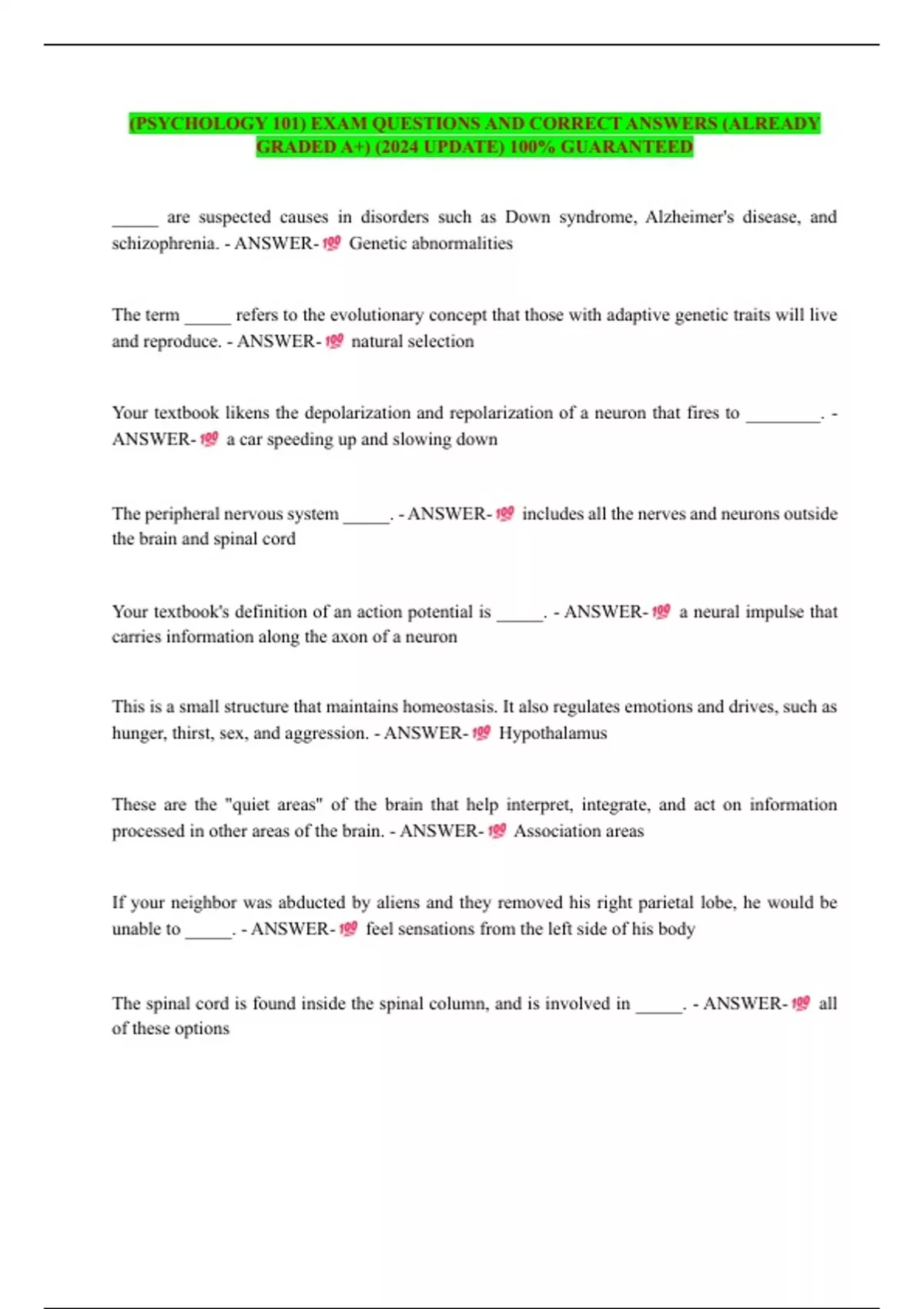 (PSYCHOLOGY 101) EXAM QUESTIONS AND CORRECT ANSWERS (ALREADY GRADED A+) (2024 UPDATE) 100% GUARANTEED. _____ are suspected causes in disorders such as Down syndrome, Alzheimer's disease, and schizophrenia. - ANSWER- Genetic abnormalities The term _____ refers to the evolutionary concept that those with adaptive genetic traits will live and reproduce. - ANSWER- natural selection Your textbook likens the depolarization and repolarization of a neuron that fires to ________. - ANSWER- a car speeding up and slowing down The peripheral nervous system _____. - ANSWER- includes all the nerves and neurons outside the brain and spinal cord Your textbook's definition of an action potential is _____. - ANSWER- a neural impulse that carries information along the axon of a neuron This is a small structure that maintains homeostasis. It also regulates emotions and drives, such as hunger, thirst, sex, and aggression. - ANSWER- Hypothalamus These are the "quiet areas" of the brain that help interpret, integrate, and act on information processed in other areas of the brain. - ANSWER- Association areas If your neighbor was abducted by aliens and they removed his right parietal lobe, he would be unable to _____. - ANSWER- feel sensations from the left side of his body The spinal cord is found inside the spinal column, and is involved in _____. - ANSWER- all of these options The peripheral nervous system is made up of the ______ nervous systems. - ANSWER- somatic and autonomic Endogenous opioid peptides are called ______. - ANSWER- endorphins This neurotransmitter is suspected of playing a role in Alzheimer's disease. - ANSWERAcetylcholine