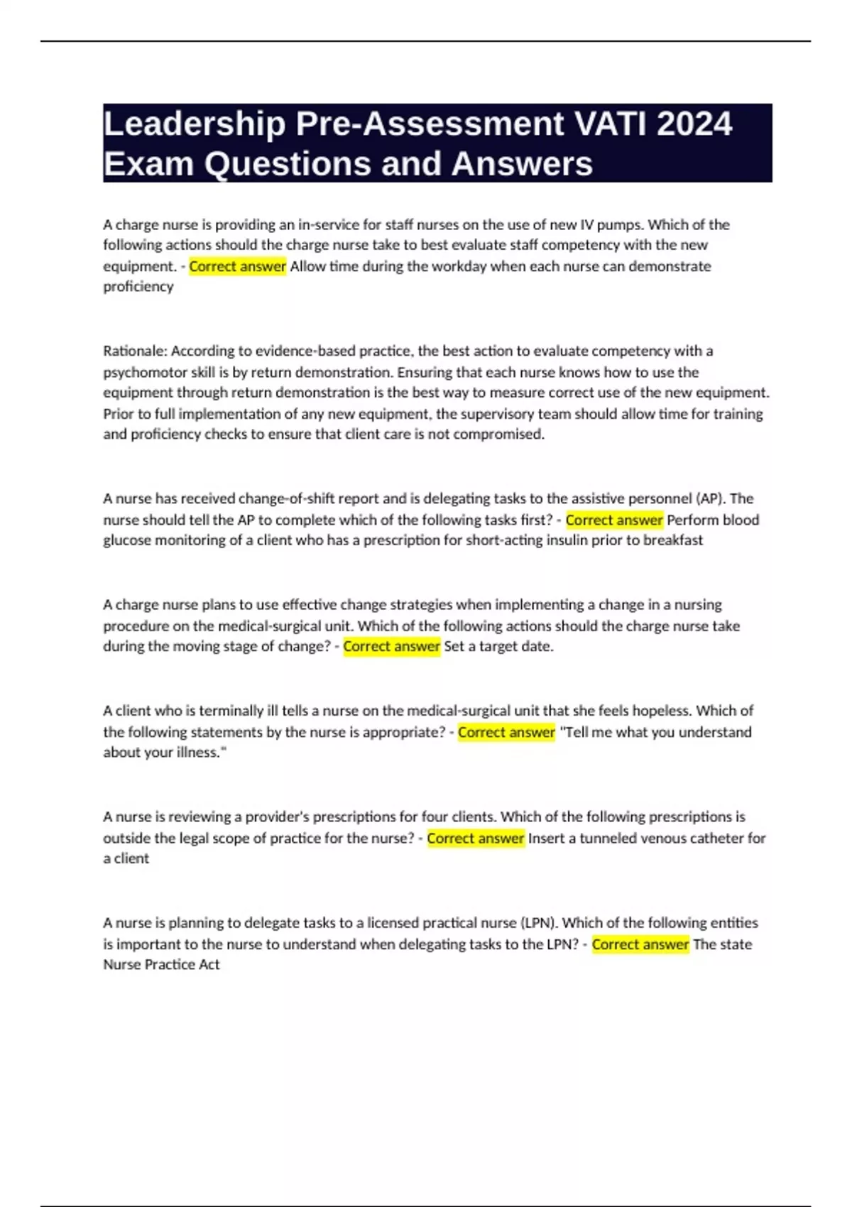 Leadership Pre-Assessment VATI 2024 Exam Questions and Answers.