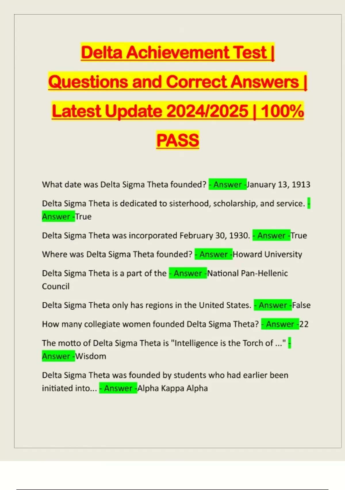 Delta Achievement Test | Questions and Correct Answers | Latest Update 2024/2025 | 100% PASS What date was Delta Sigma Theta founded? - Answer -January 13, 1913 Delta Sigma Theta is dedicated to sisterhood, scholarship, and service. - Answer -True Delta Sigma Theta was incorporated February 30, 1930. - Answer -True Where was Delta Sigma Theta founded? - Answer -Howard University Delta Sigma Theta is a part of the - Answer -National Pan-Hellenic Council Delta Sigma Theta only has regions in the United States. - Answer -False How many collegiate women founded Delta Sigma Theta? - Answer -22 The motto of Delta Sigma Theta is "Intelligence is the Torch of ..." - Answer -Wisdom Delta Sigma Theta was founded by students who had earlier been initiated into... - Answer -Alpha Kappa AlphaDelta Sigma Theta felt Alpha Kappa Alpha was solely a female derivative of Alpha Phi Alpha with no individual meaning.. - Answer -True Who was named the 1st president of Delta Sigma Theta's Alpha Chapter? - Answer -Myra Davis Hemming