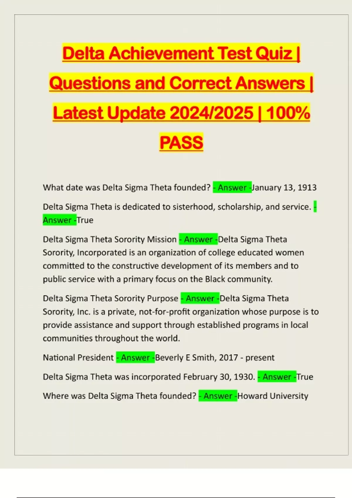 Delta Achievement Test Quiz | Questions and Correct Answers | Latest Update 2024/2025 | 100% PASS What date was Delta Sigma Theta founded? - Answer -January 13, 1913 Delta Sigma Theta is dedicated to sisterhood, scholarship, and service. - Answer -True Delta Sigma Theta Sorority Mission - Answer -Delta Sigma Theta Sorority, Incorporated is an organization of college educated women committed to the constructive development of its members and to public service with a primary focus on the Black community. Delta Sigma Theta Sorority Purpose - Answer -Delta Sigma Theta Sorority, Inc. is a private, not-for-profit organization whose purpose is to provide assistance and support through established programs in local communities throughout the world. National President - Answer -Beverly E Smith, 2017 - present Delta Sigma Theta was incorporated February 30, 1930. - Answer -True Where was Delta Sigma Theta founded? - Answer -Howard UniversityDelta Sigma Theta is a part of the - Answer -National Pan-Hellenic Council Delta Sigma Theta only has regions in the United States. - Answer -False How many collegiate women founded Delta Sigma The