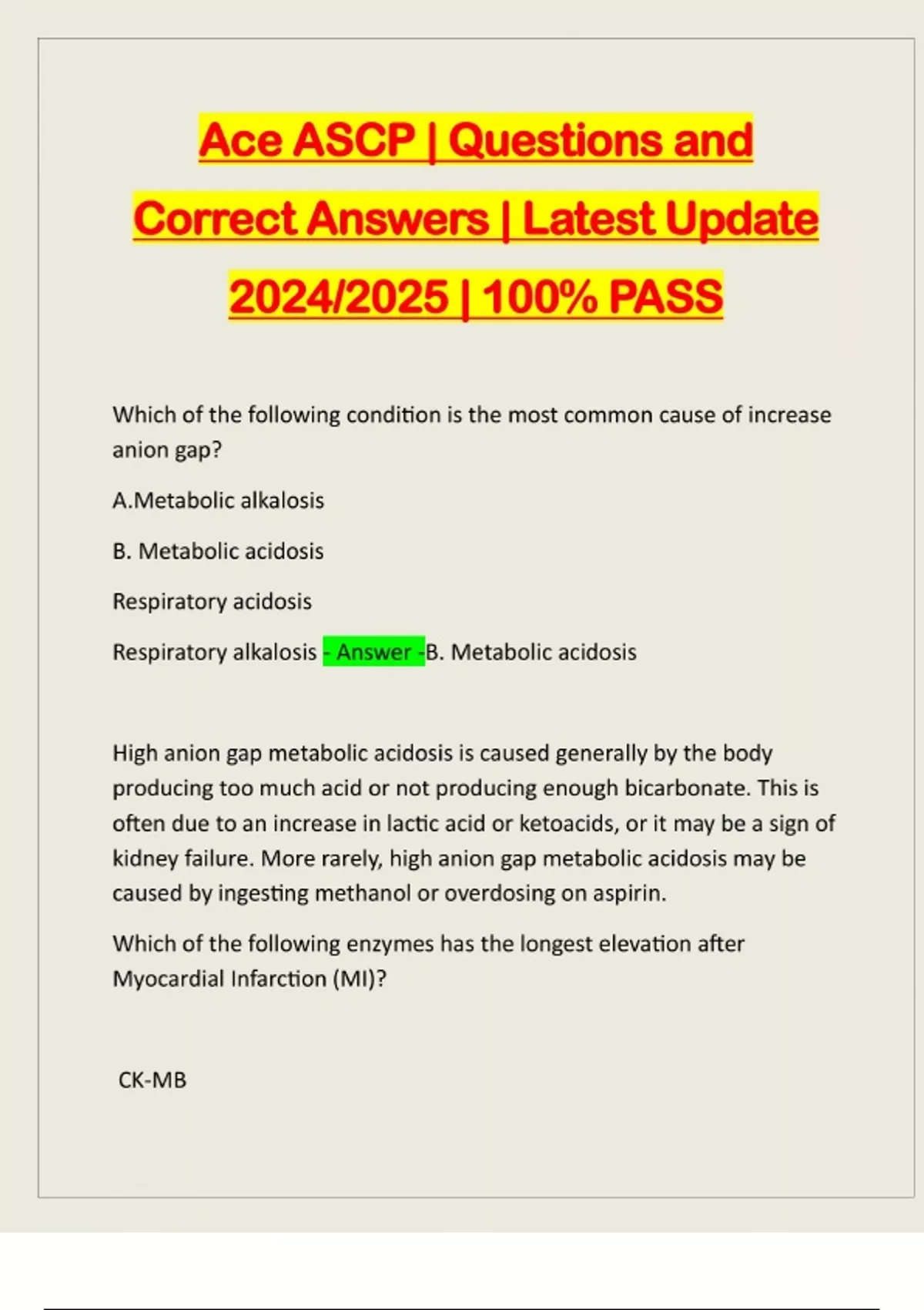 Ace ASCP | Questions and Correct Answers | Latest Update 2024/2025 | 100% PASS Which of the following condition is the most common cause of increase anion gap? A.Metabolic alkalosis B. Metabolic acidosis Respiratory acidosis Respiratory alkalosis - Answer -B. Metabolic acidosis High anion gap metabolic acidosis is caused generally by the body producing too much acid or not producing enough bicarbonate. This is often due to an increase in lactic acid or ketoacids, or it may be a sign of kidney failure. More rarely, high anion gap metabolic acidosis may be caused by ingesting methanol or overdosing on aspirin. Which of the following enzymes has the longest elevation after Myocardial Infarction (MI)? CK-MBMyoglobin Troponin AOTA - Answer -C. Troponin Troponin is elevated up to 10-14 days after Myocardial Infarction. Lactic acid specimen: Chilled and separated from cells Heated Room temperature Request EDTA sample only - Answer -A. Chilled and
