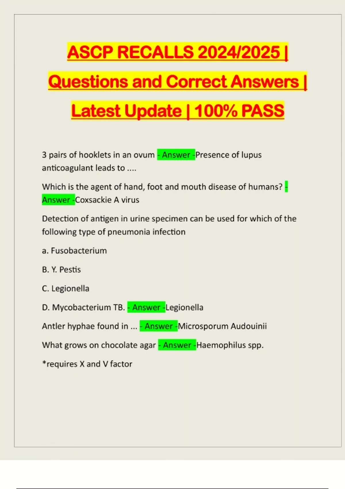 ASCP RECALLS 2024/2025 | Questions and Correct Answers | Latest Update | 100% PASS 3 pairs of hooklets in an ovum - Answer -Presence of lupus anticoagulant leads to .... Which is the agent of hand, foot and mouth disease of humans? - Answer -Coxsackie A virus Detection of antigen in urine specimen can be used for which of the following type of pneumonia infection a. Fusobacterium B. Y. Pestis C. Legionella D. Mycobacterium TB. - Answer -Legionella Antler hyphae found in ... - Answer -Microsporum Audouinii What grows on chocolate agar - Answer -Haemophilus spp. *requires X and V factorIt could grow around colonies of with Staph. Aureus forming Satellitism as Staph. Aureus (in addition Neisseria and Pneumococcus) releases NAD AKA factor Factor 5. Hemin is factor 10. Double zone of hemolysis and beta lactamase - Answer -Clostridium Perfringens Which increases first after an MI - Answer -Myoglobi